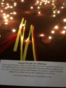 Taking pipe cleaners, make an action figure or two to symbolize both your God-giftedness and the justice-sharing that God has uniquely called you to do in your community, family, relationships, the world or realm of activity. Reflect for a while now on the significance of all this. Invite God to keep this alive in your faith journey.