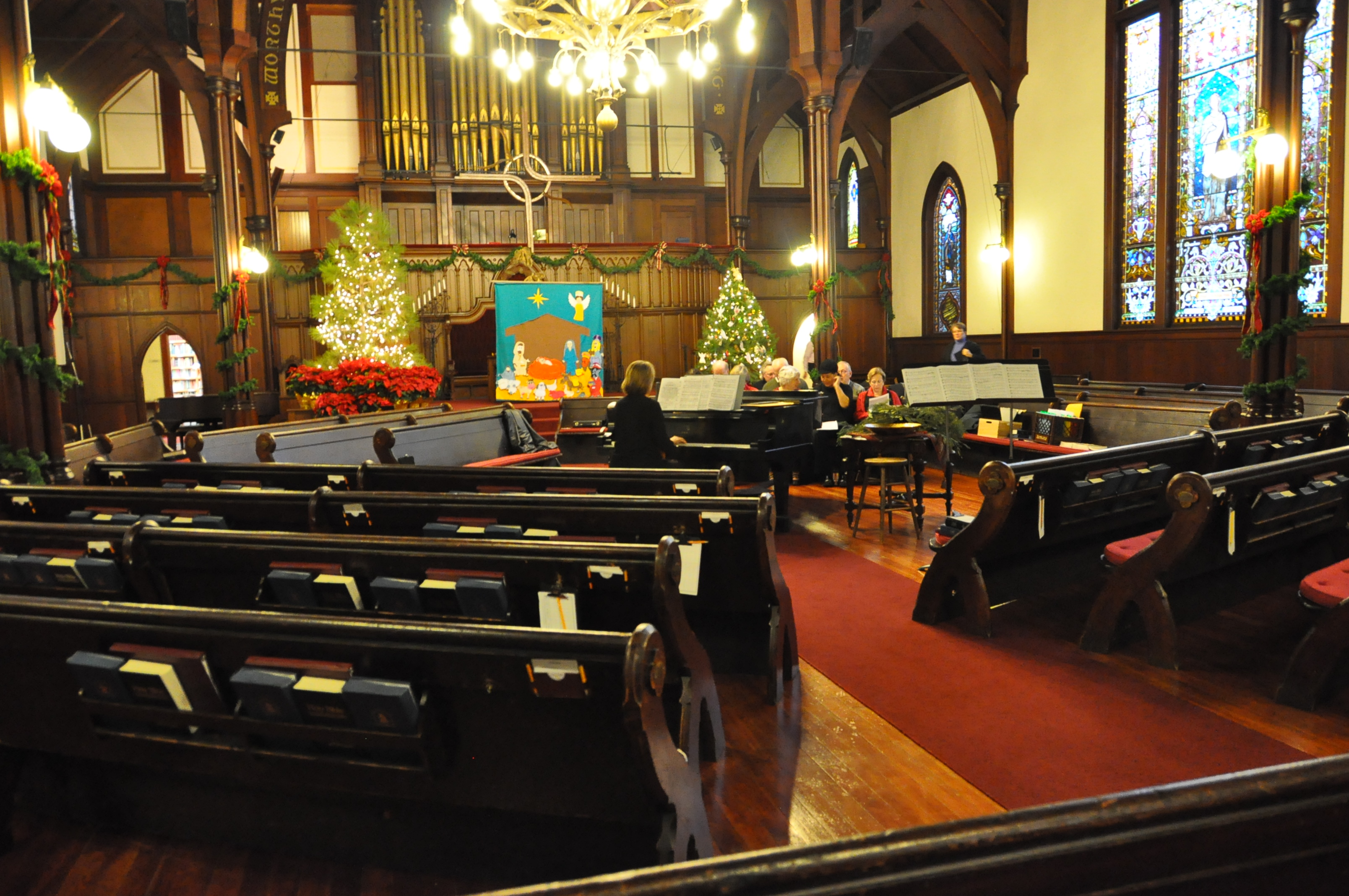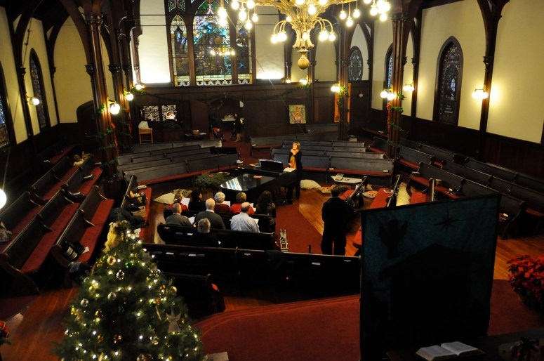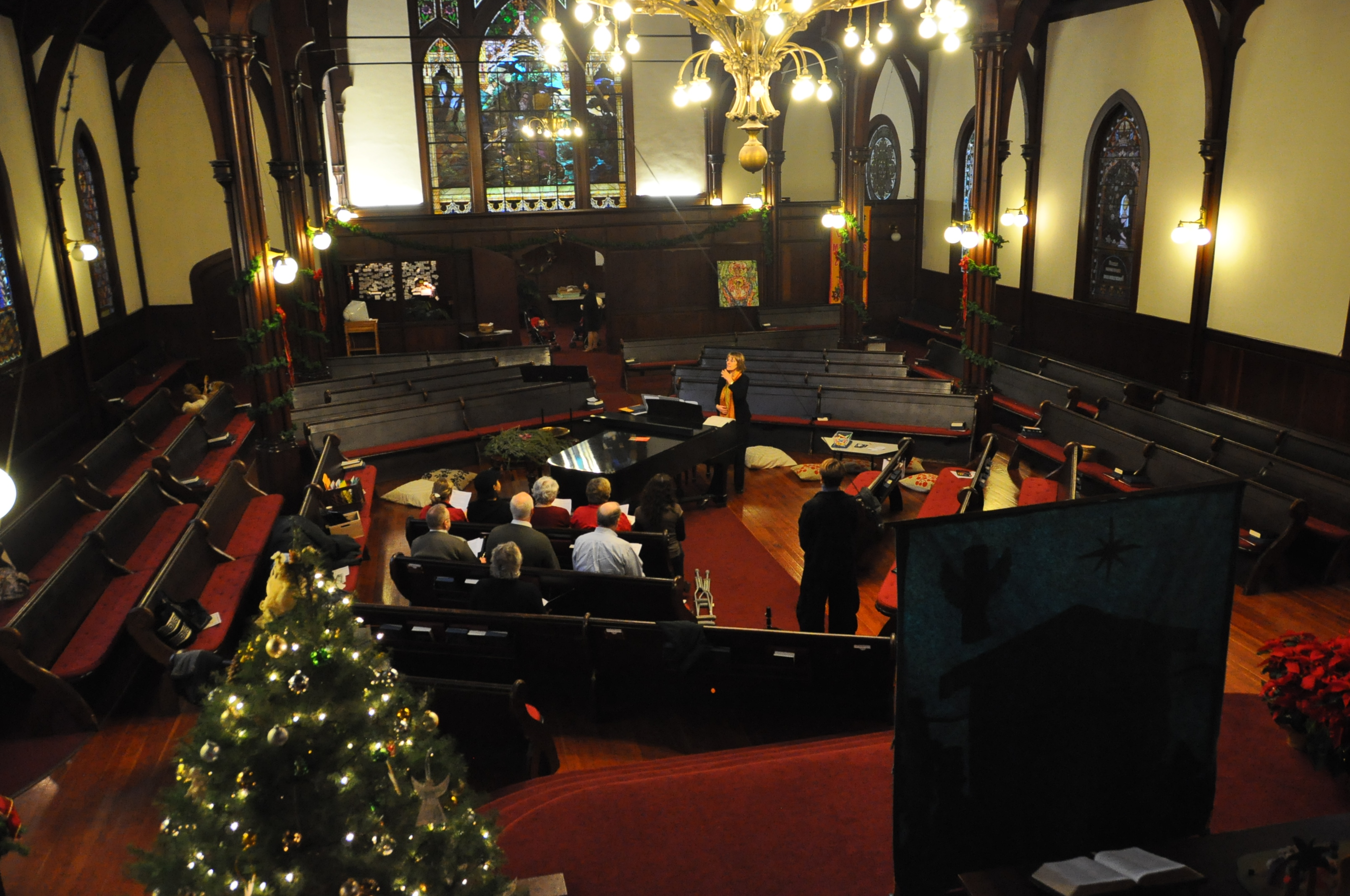 - Worship space: Most sanctuaries are not amenable to rearranging the pews or changing the layout of seating. But recently some broken pews gave St. John’s an opportunity to look at our layout and make it possible to move and rearrange the pews for different occasions and move them back for Sunday. This Sunday before Christmas was our first opportunity to move the seating. The plan was to pull the Steinway Grand piano into the center with the choir seated next it. Pews form a circle with pillows and coloring tables in the middle for kids to sit if they would like.