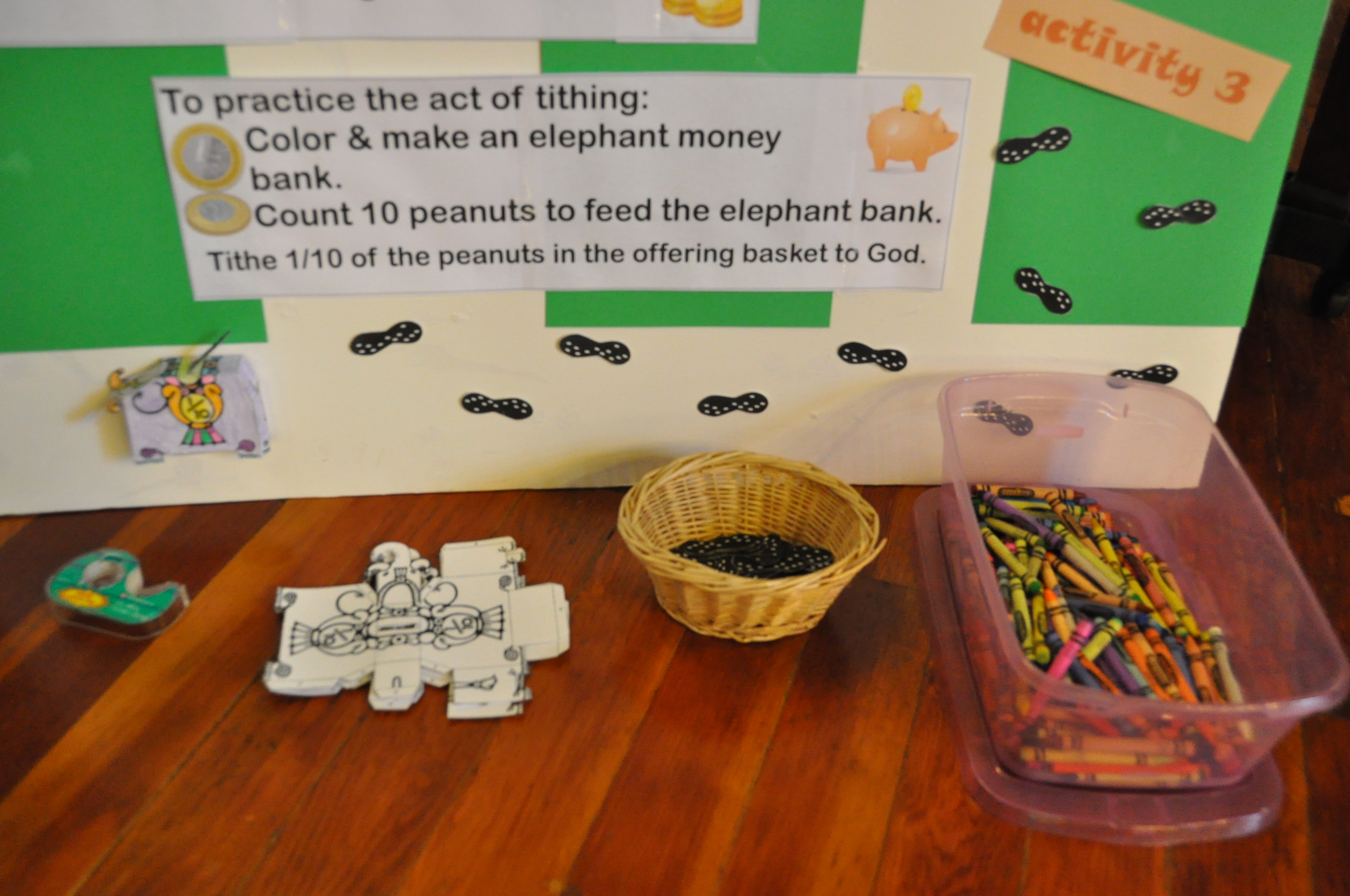Activity Three: To practice tithing: color the elephant bank, count 10 peanuts, and feed 1/10 of the peanuts to the elephant bank.
