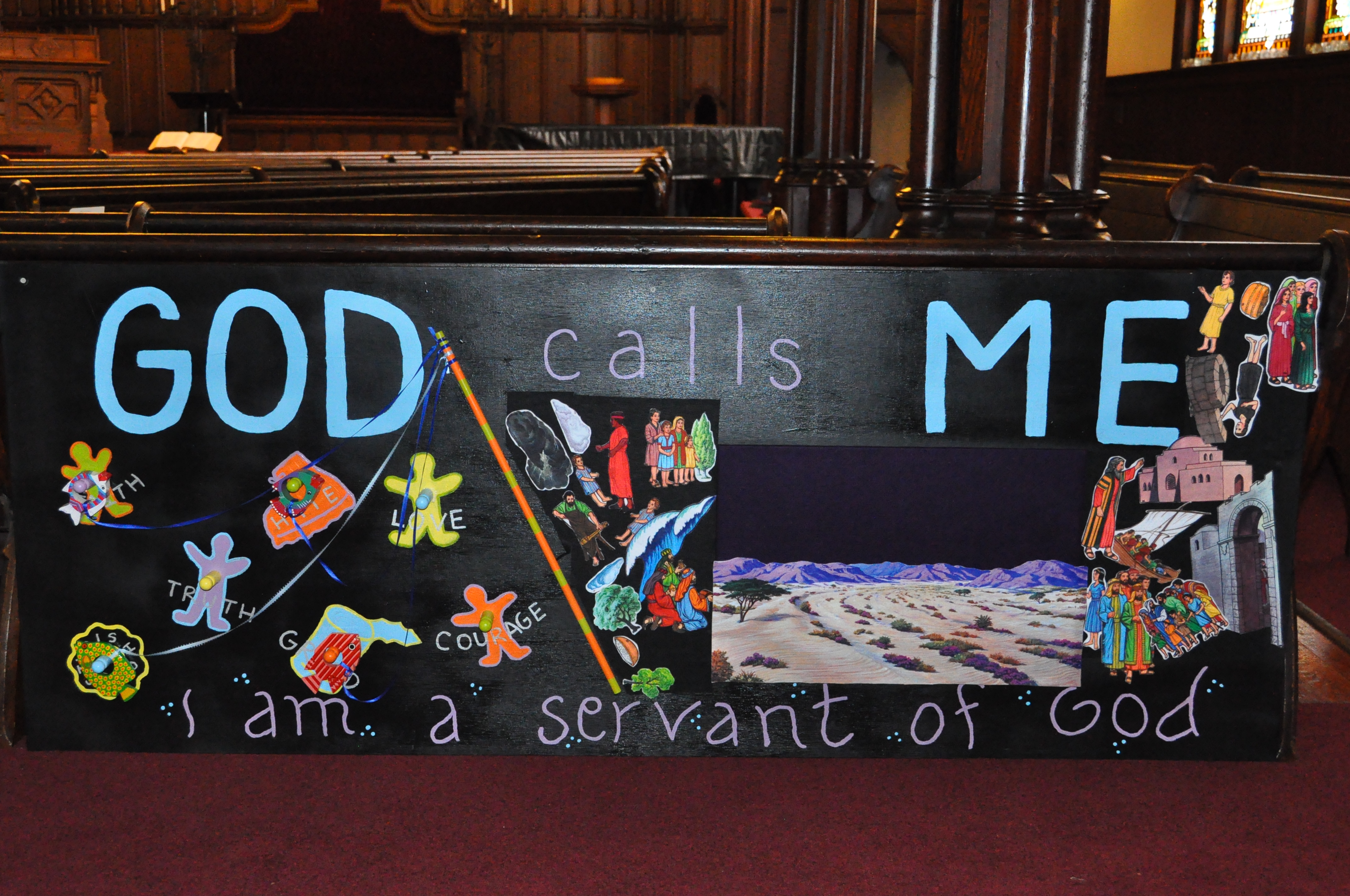 One of the challenges we constantly face is how to worship as an intergenerational community. However, one thing that we are intentional about is creating a space that is family-friendly. Although we do provide nursery care that is close to the sanctuary, we also allow space for babes in arms and crawling toddlers. This provided us an opportunity to transform some of our broken pews into interactive boards that would teach theological concepts in tangible and concrete form. Below is a slideshow on how I transformed four pews into four interactive boards that were adhered to the backs of these pews.