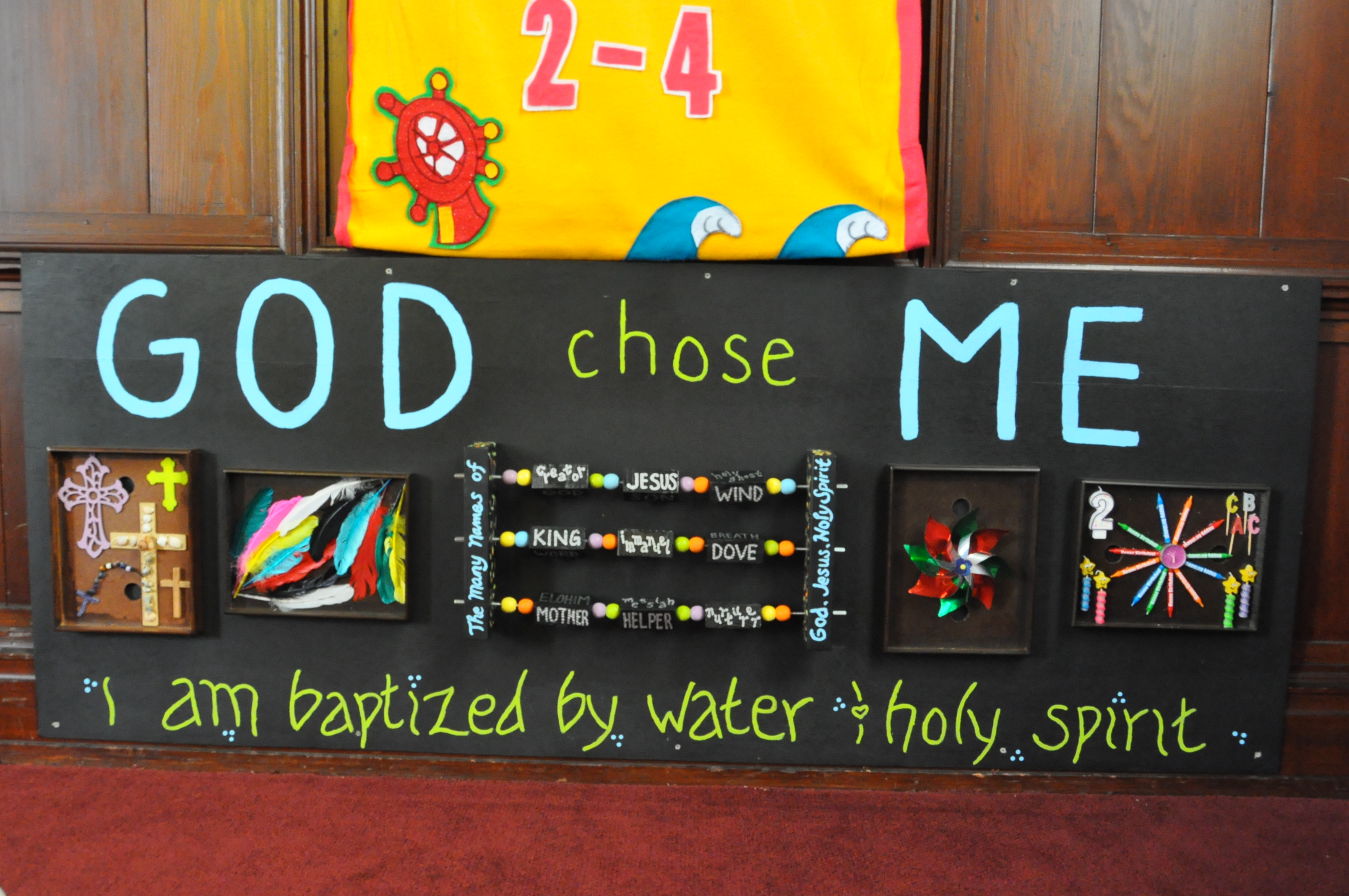 Board #2: God Chose Me – opportunity to feel different symbols of baptism and explore different trinitarian names.