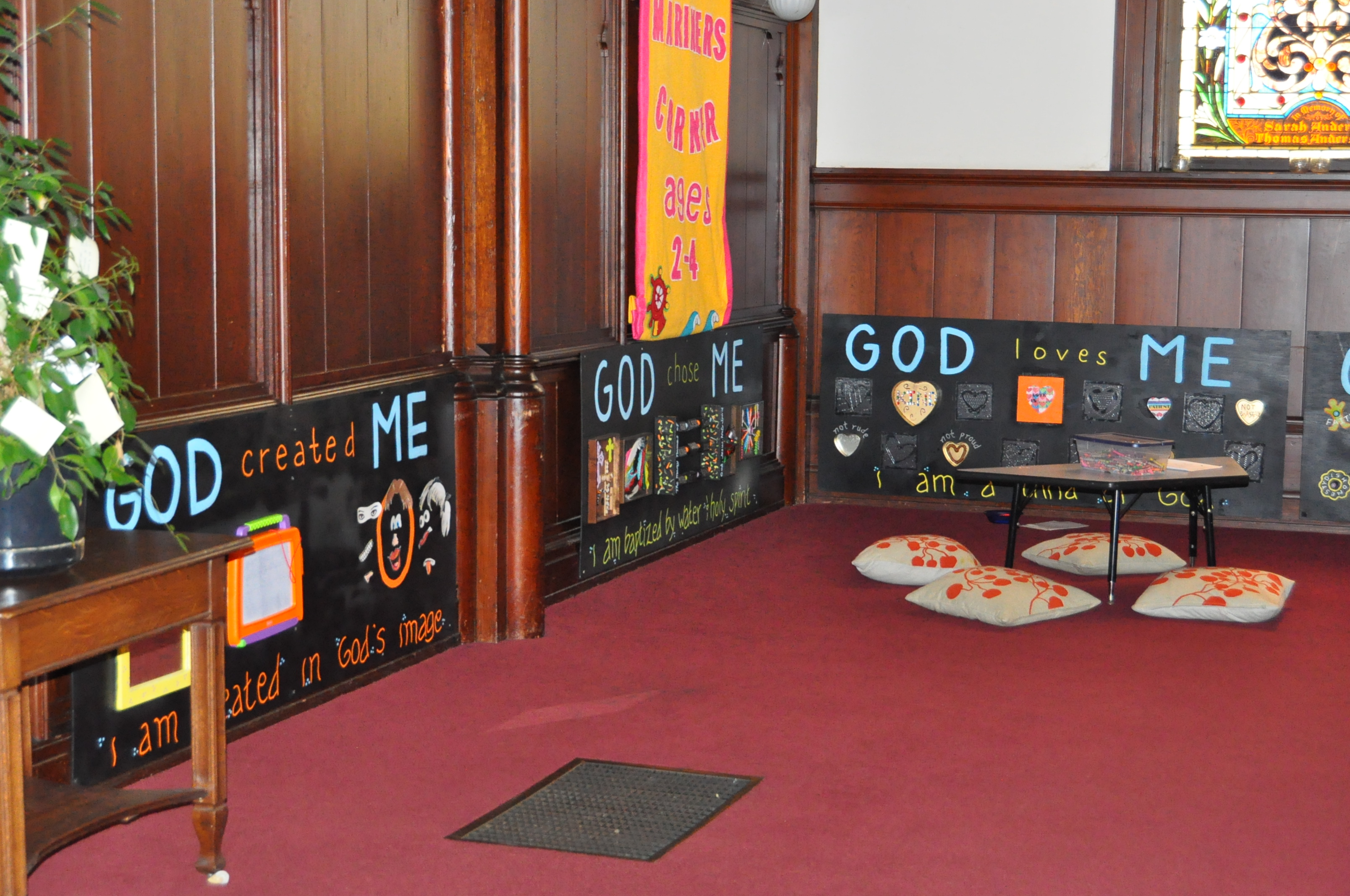 I am really thinking about doing this in our toddler corner. Except we used our broken pews for a deck at the manse. Thanks for the inspiration. Jeff is so right you are creative and imaginative!