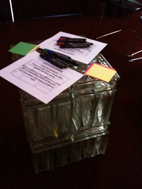 Adaptation for kids: Life can be hard. There can be many obstacles, which feel like walls. Draw a picture of an obstacle in your life or something difficult for you. Fold the paper and insert in glass wall.