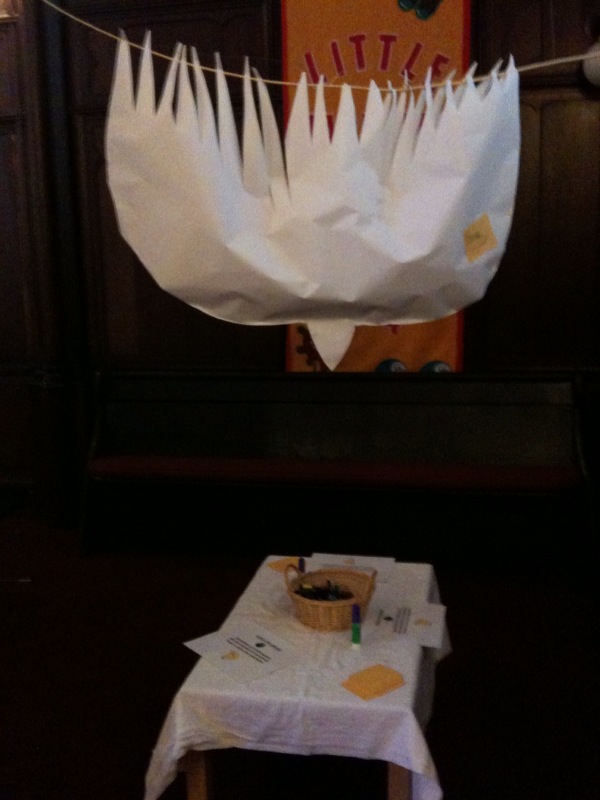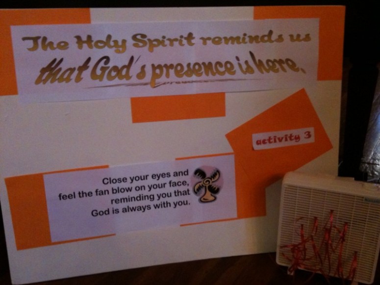 Pentecost provides a lot of wonderful images to center interactive prayer stations around: birthday, fire, breath, and wind – just to name a few. Below are ideas for interactive prayer stations focusing on how the spirit moves us through doubt, obstacles, and blessings. The interactive prayer stations are meant to be intergenerational. There are also stations designed for ages 2-4. (For more specific instructions on layout, purpose, design, and more ideas, you can view previous posts tagged under “Interactive Prayer Stations.”) You can see more pictures of these prayer stations here.