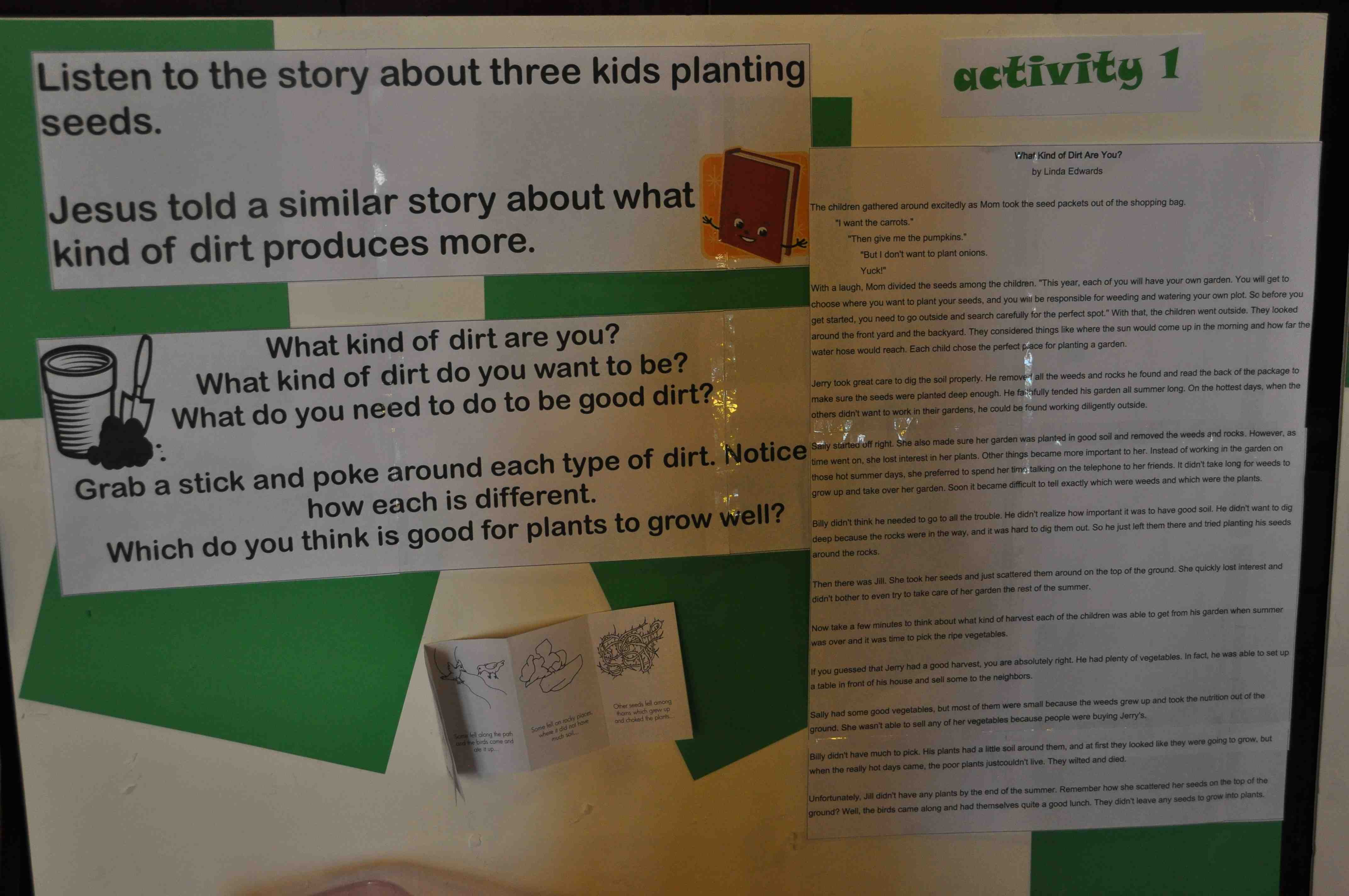 Activity one: Listen to the story about three kids planting seeds. Jesus told a similar story about what kind of dirt produces more. What kind of dirt are you? What kind of dirt do you want to be? What do you need to do to be good dirt? Grab a stick and poke each type of dirt. Notice how each is different. Which do you think is good for plants to grow well?