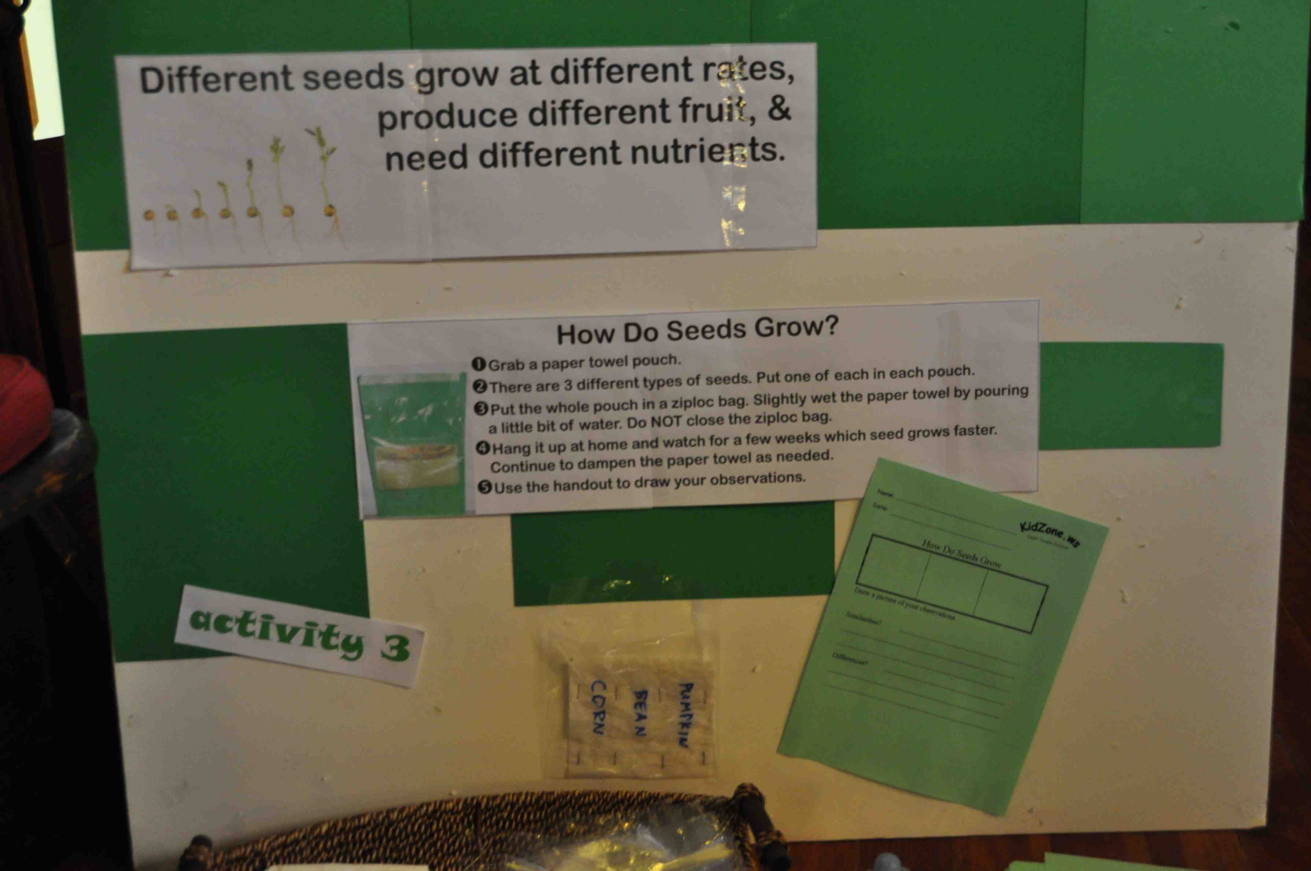 Activity three: Different seeds grow at different rates, produce different fruit and need different nutrients. How Do Seeds Grow? 1) Grab a paper towel pouch. 2) There are 3 different types of seeds. Put one of each in each pouch. 3) Put the whole pouch in a ziploc bag. Slightly wet the paper towel by pouring a little bit of water. Do NOT close the ziploc bag. 4) Hang it up at home and watch for a few weeks which seed grows faster. Continue to dampen the paper towel as needed. 5) Use the handout to draw your observations.