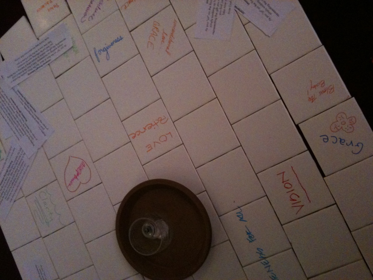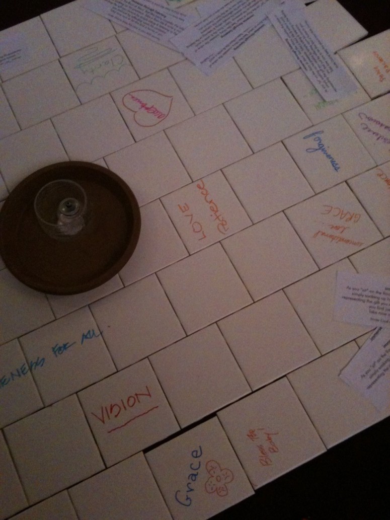 As you “sit” on the floor at Jesus’ feet like Mary, consider the value of simply soaking up his presence. Take a floor tile and write a word representing the gift you receive by simply sitting and listening or the feeling you find just by reflecting upon his company.