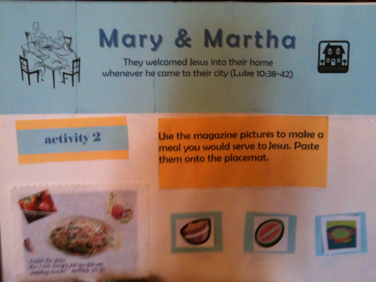 Activity two: Use the magazine pictures to make a meal you would serve to Jesus. Paste them onto the placemat.