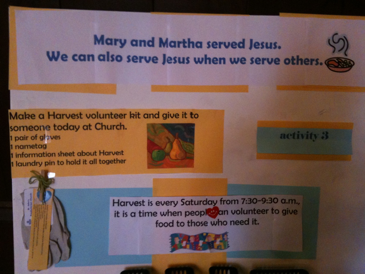 Materials: Clothes Pin, Latex Gloves, Nametag, Info Sheet about Harvest, Heart Sticker