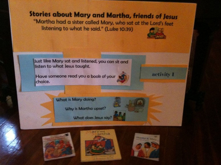 Materials: A variety of Children’s Books on Mary & Martha such as Mary and Martha’s Dinner Guest – Arch Books by Swanee Ballman and Joe Boddy, Martha and Mary Friends Of Jesus by Carine Mackenzie, Mary and Martha by Marty Rhodes Figley and Cat Bowman Smith