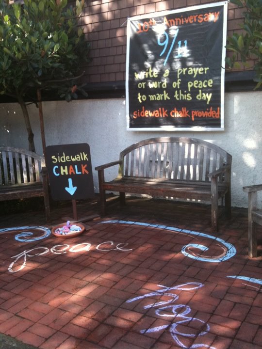 As we approach the 10th anniversary of 9/11, write a prayer or words of peace on the sidewalk. Let these prayers and words be our hope for our community and world.