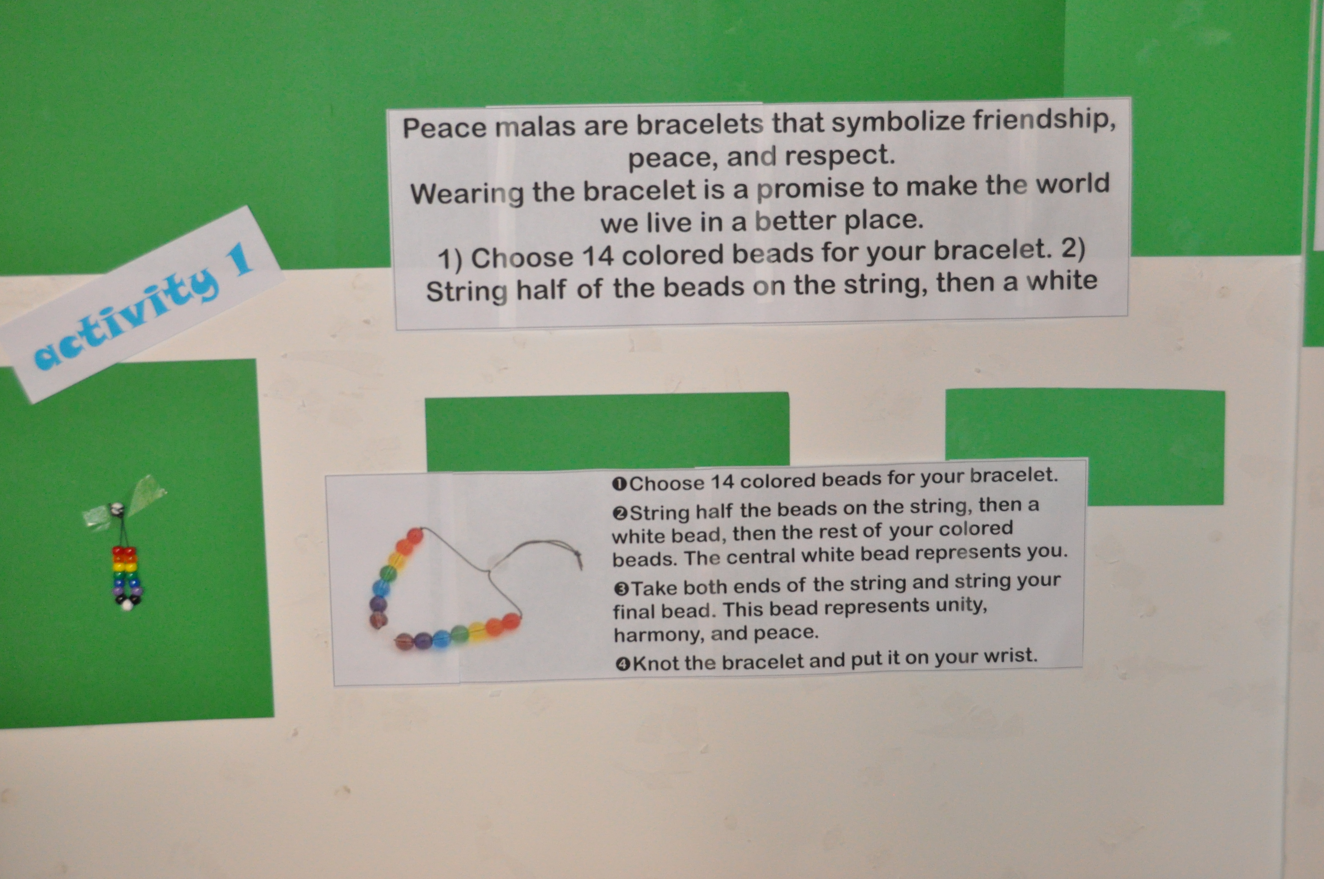 Activity two: Peace malas are bracelets that symbolize friendship, peace, and respect. Wearing the bracelet is a promise to make the world we live in a better place. 1) Choose 14 colored beads for your bracelet. 2) String half of the beads on the string, then a white bead, then the rest of your colored beads. The central white bead represents you. 3) Take both ends of the string and string your final bead. This bead represents unity, harmony, and peace. 4) Knot the bracelet and put it on your wrist.