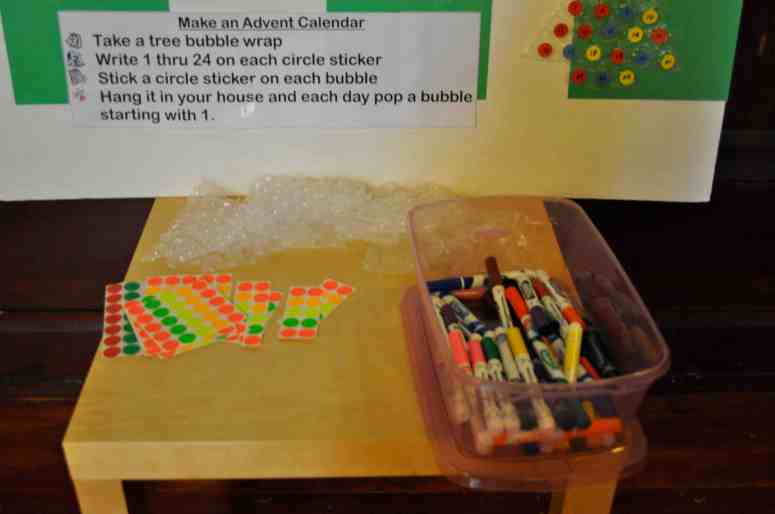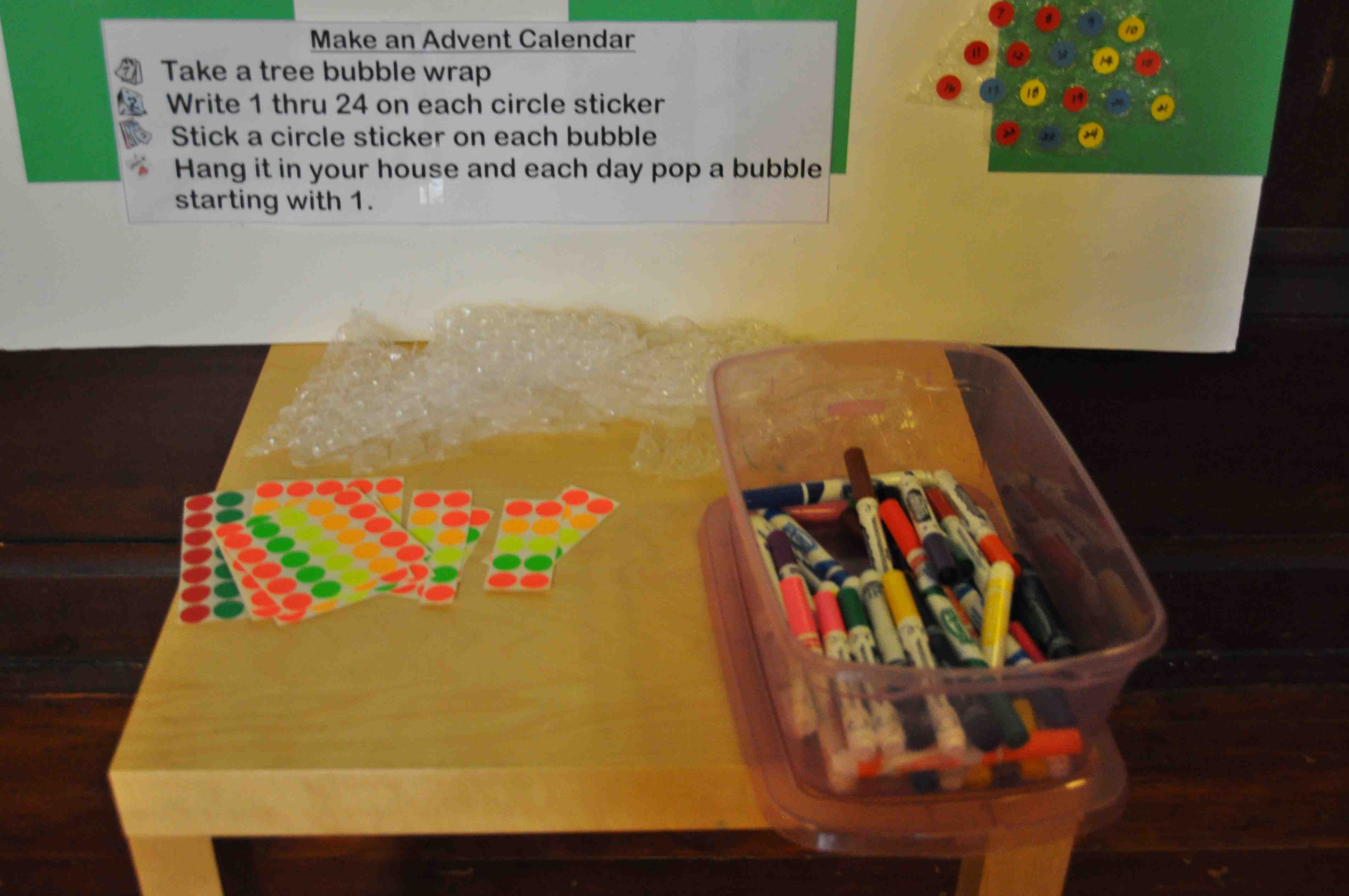 Activity three: Today is the first Sunday of Advent. Advent is a time when we wait for Christmas when Jesus was born. Children all over the world count down the 24 days until Christmas using an Advent calendar. Make an Advent Calendar: 1) Take a tree bubble wrap; 2) Write 1 through 24 on each circle sticker; 3) Stick a circle sticker in order on each bubble; 4) Hang it in your house and each day pop a bubble.