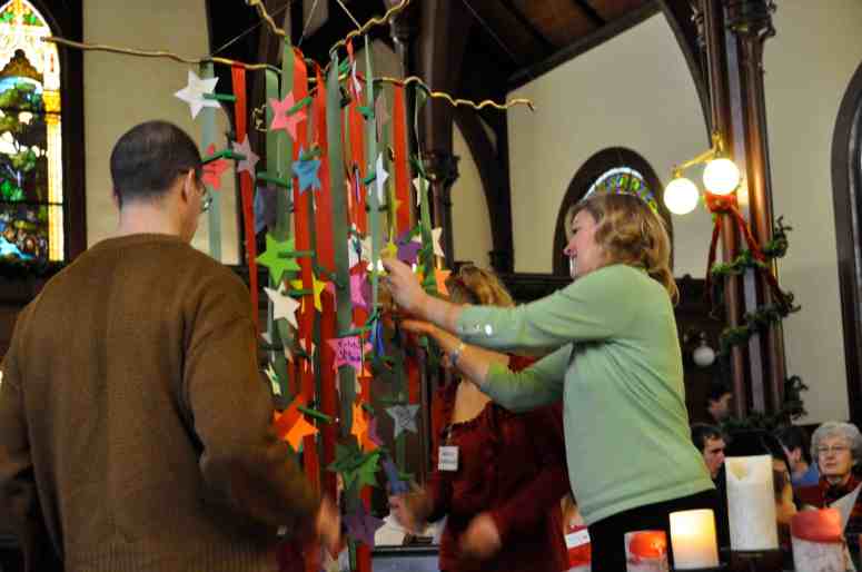 Afterward, stars and markers were passed out and as I read the poem again, the congregation reflected on what they seek or need guidance for as we approach Christmas day. After they wrote it on their star, they were invited to pin it on the ribbon mobile which hung in the middle of the sanctuary on a pulley system. This allowed the mobile to hang high during worship and then be lowered for the interactive activity.