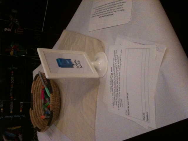 Materials: Handout, Pens, Basket, “Snail Mail” Sign