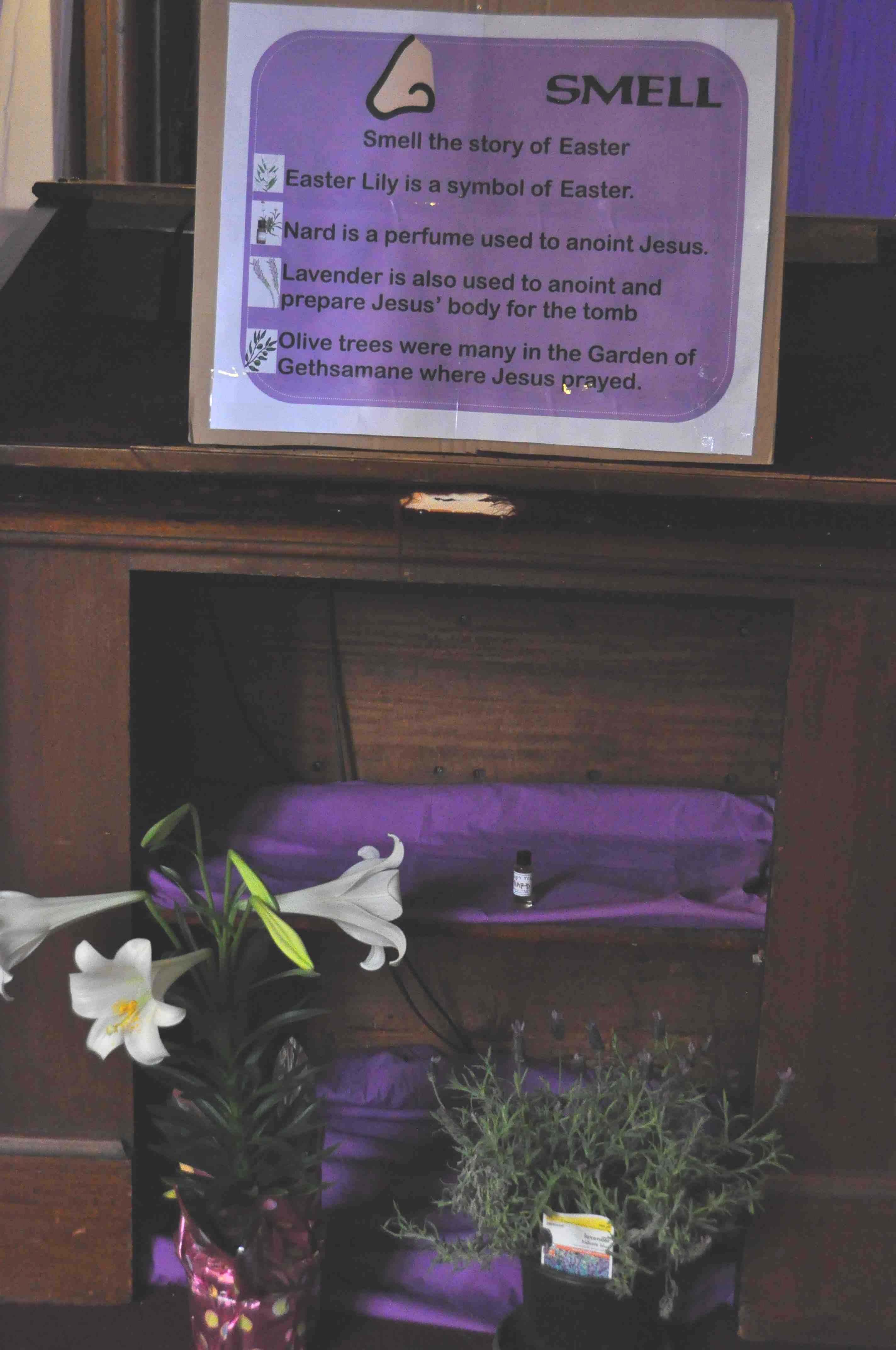 Activity one: Smell the story of Easter. Easter Lily is a symbol of Easter. Nard is a perfume used to anoint Jesus. Lavender is also used to anoint and prepare Jesus’ body for the tomb. Olive trees were many in the Garden of Gethsemane where Jesus prayed.