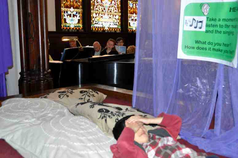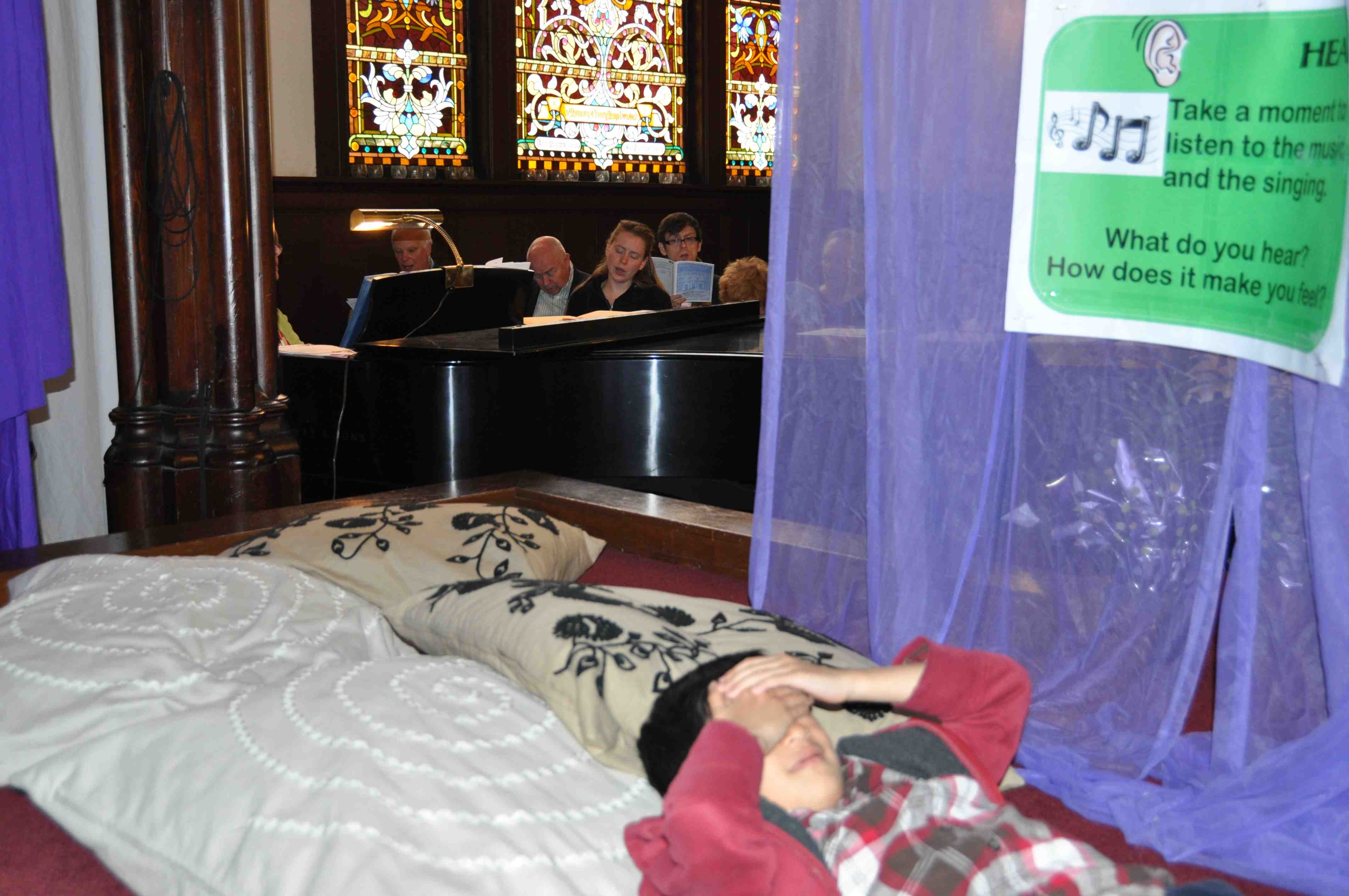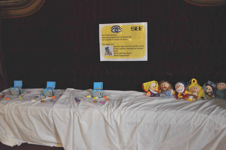 The chancel area was turned into an empty tomb to house the interactive prayer stations. The stations were centered on the five senses. As Thomas needed to touch Jesus, the stations provide an opportunity to engage in the story through their senses.