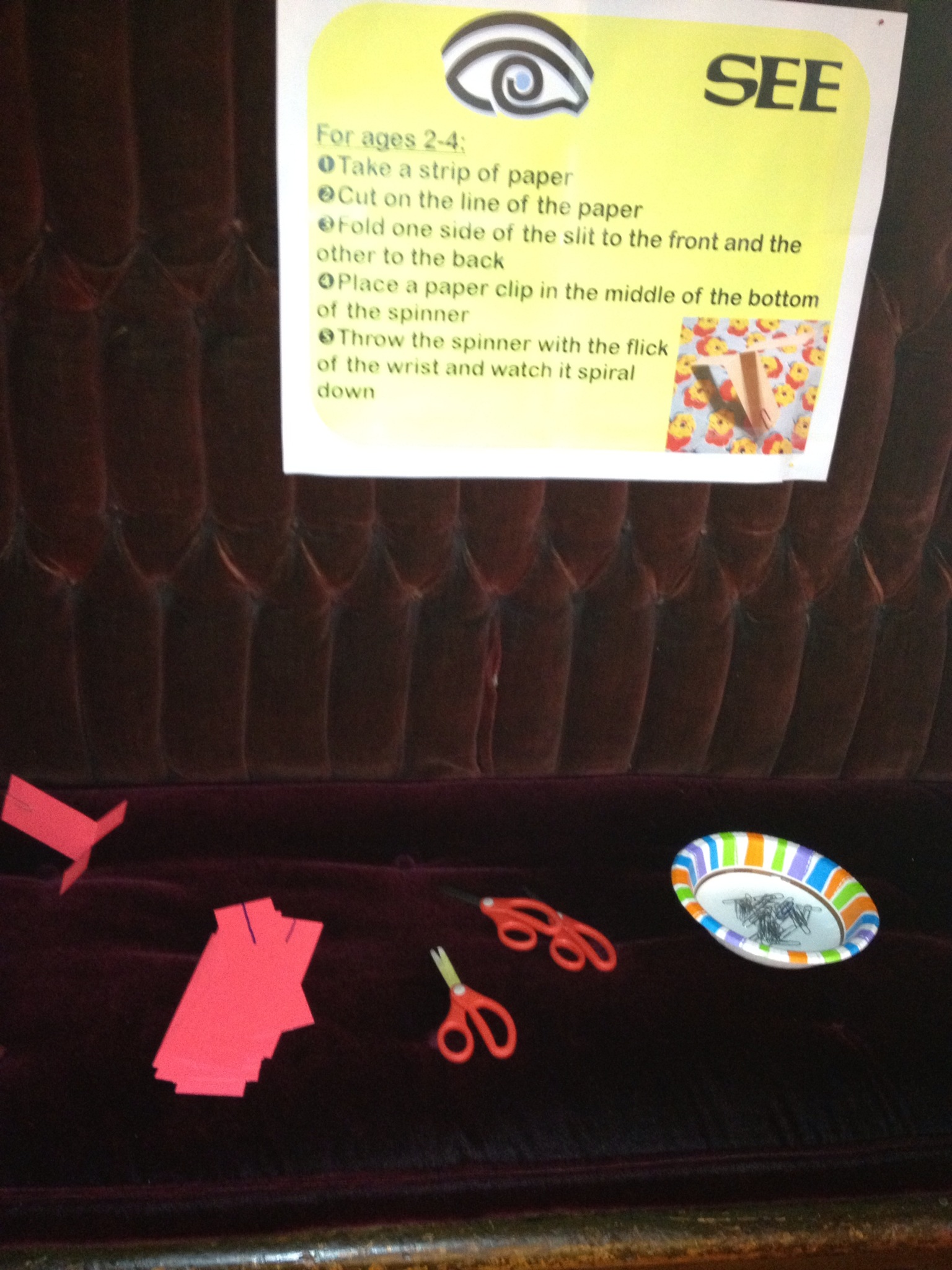 For ages 2-4: 1) Take a strip of paper; 2) cut on the line of the paper; 3) Fold one side of the slit to the front and the other to the back; 4) Place a paper clip in the middle of the spinner; 5) throw the spinner with the flick of the wrist and watch it spiral down. (Here are detailed directions.)