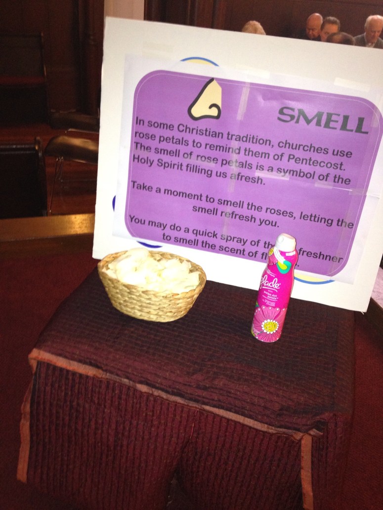 The chancel area was decorated like a birthday party to house the interactive prayer stations. The stations were centered on the senses.