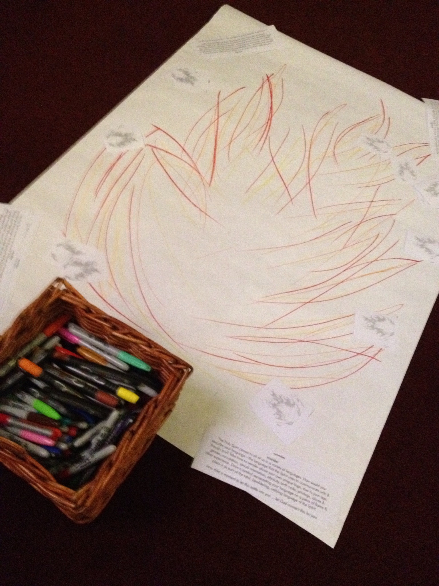 The Holy Spirit comes to all of us in a variety of languages. How would you describe your language – the language that the Spirit uses to communicate with and through you? Take time to wonder about your own unique lingo, due to your age, gender, occupation, sexual orientation, ethnicity, birth order, privilege, abuse and other experience. Draw a symbol representing your language on a piece of flame and place it as part of the total, bewildering, unifying language of the Spirit.