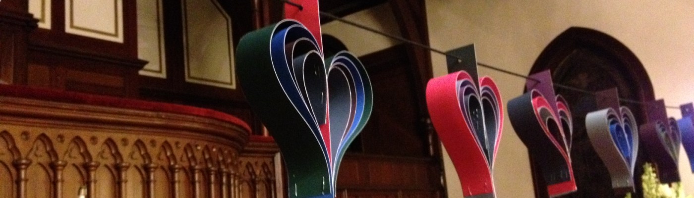 The chancel area was decorated with paper hearts and pictures of images measuring love to house the interactive prayer stations. The stations were centered on the senses.