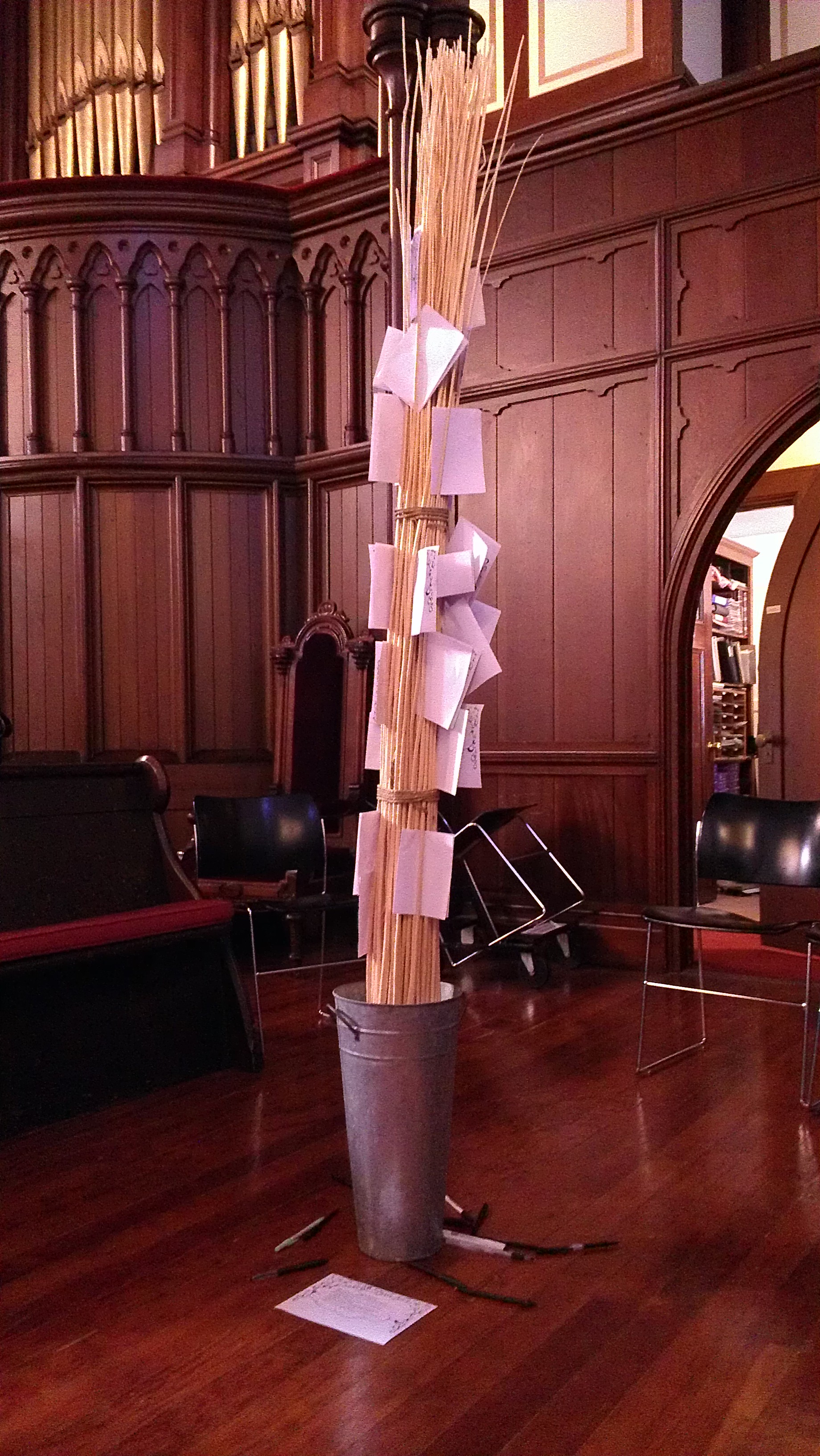 Materials: Paper, a Bundle of Tall Sticks, Bucket, Pens