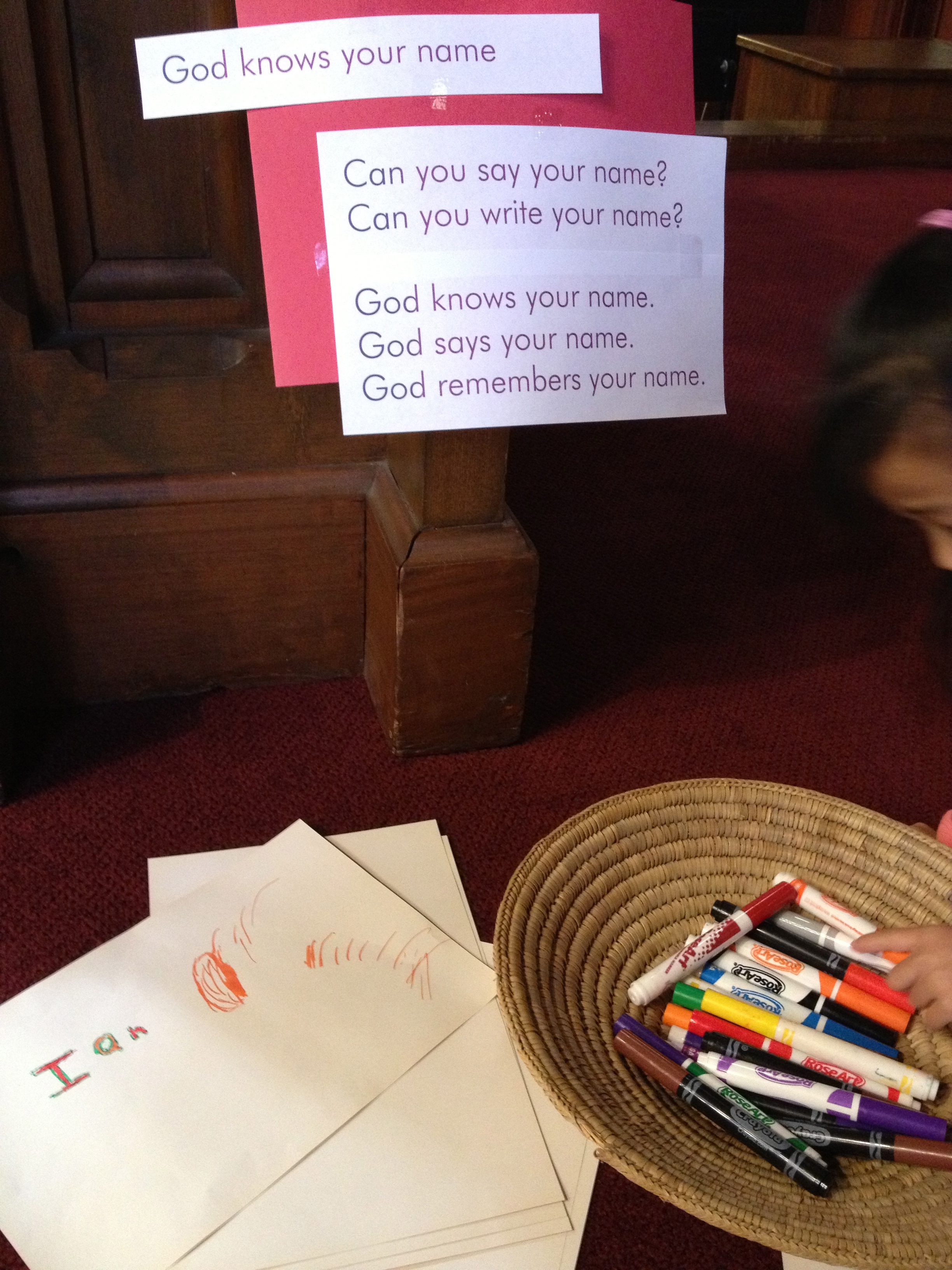Activity one: God knows your name. Can you say your name? Can you write your name? God knows your name. God says your name. God remembers your name.