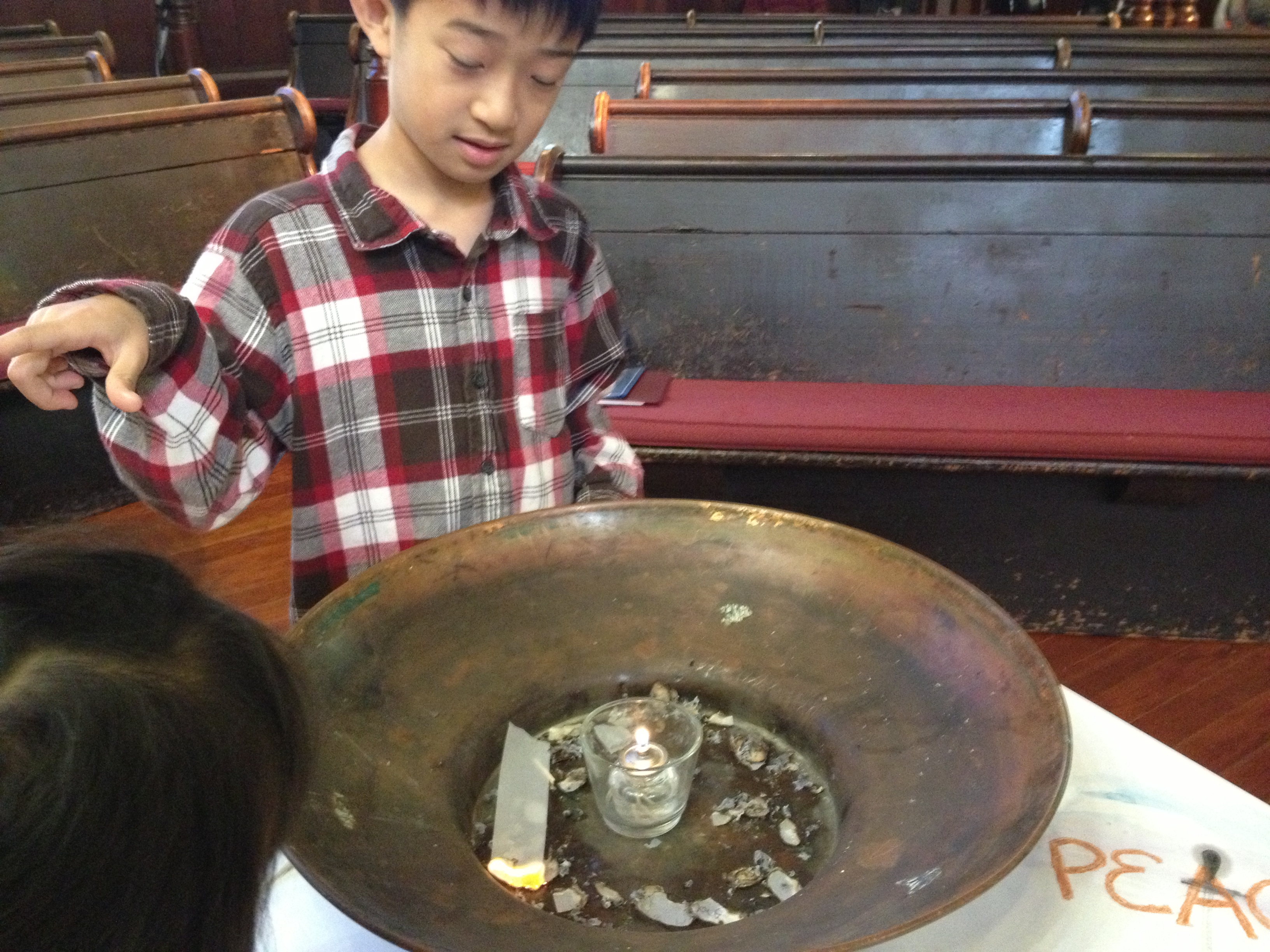 Since this Sunday was right before Ash Wednesday, I chose an “Ash Wednesday” text. Instead of preaching a sermon, I led worshipers in a lectio divina. In each bulletin, there was a strip of tracing paper. I find that tracing paper burns fast and with minimal smoke. Letting the words from Psalm 51 guide them, they were invited to write down any regrets or anything they wanted to let go of or ask of God to create in them a new heart.