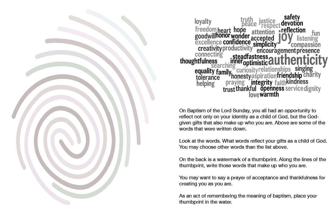 During the reflection, worshipers were invited to follow these instructions. Using the thumbprint as a symbol of who we are, they wrote words describing themselves along the lines of the thumbprint.