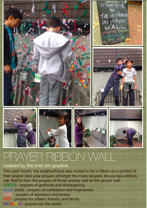The 2nd-6th graders spent a month exploring prayer. During that time, they constructed a prayer ribbon wall, inspired by this post. This prayer wall hung outside our church for a month, inviting passersby to add to it.
