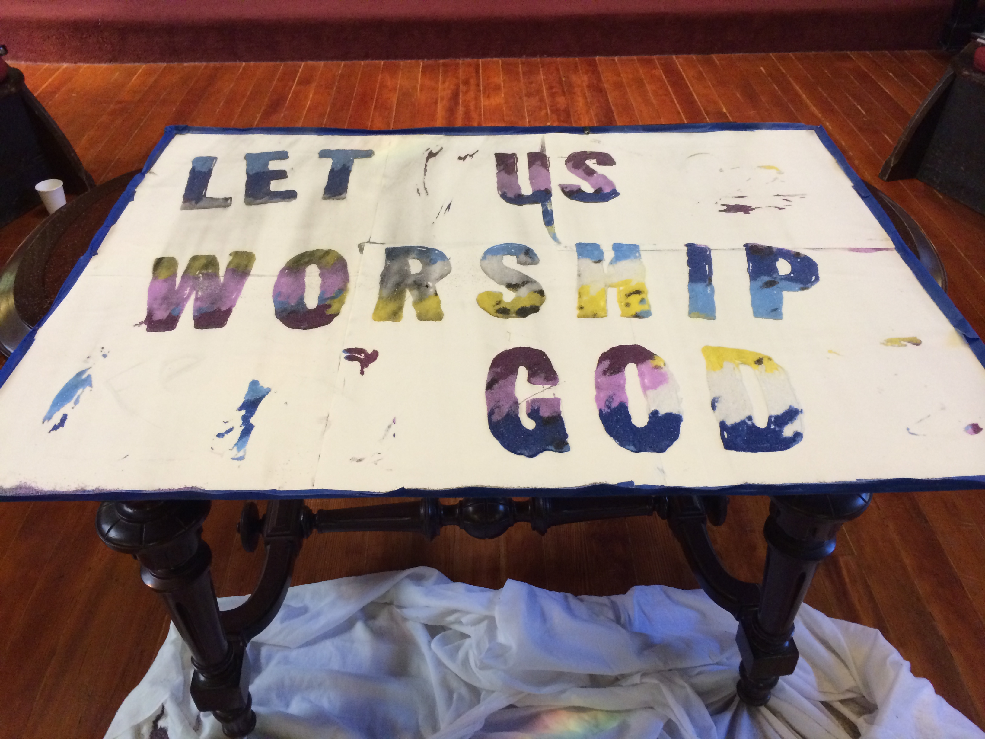 I then dumped the sand onto a piece of cloth on the floor, revealing the words “Let us worship God.” It is interesting observing the different reactions of people as they unexpectedly watch their meaningful symbols discarded onto the ground. This ritual allows us to let go of what we hold so fast to – not to eliminate or discard – but to let go of the hold it has on us to move forward. Are there are other things in worship that we can find the same meaning if the thing we hold so dear changes?