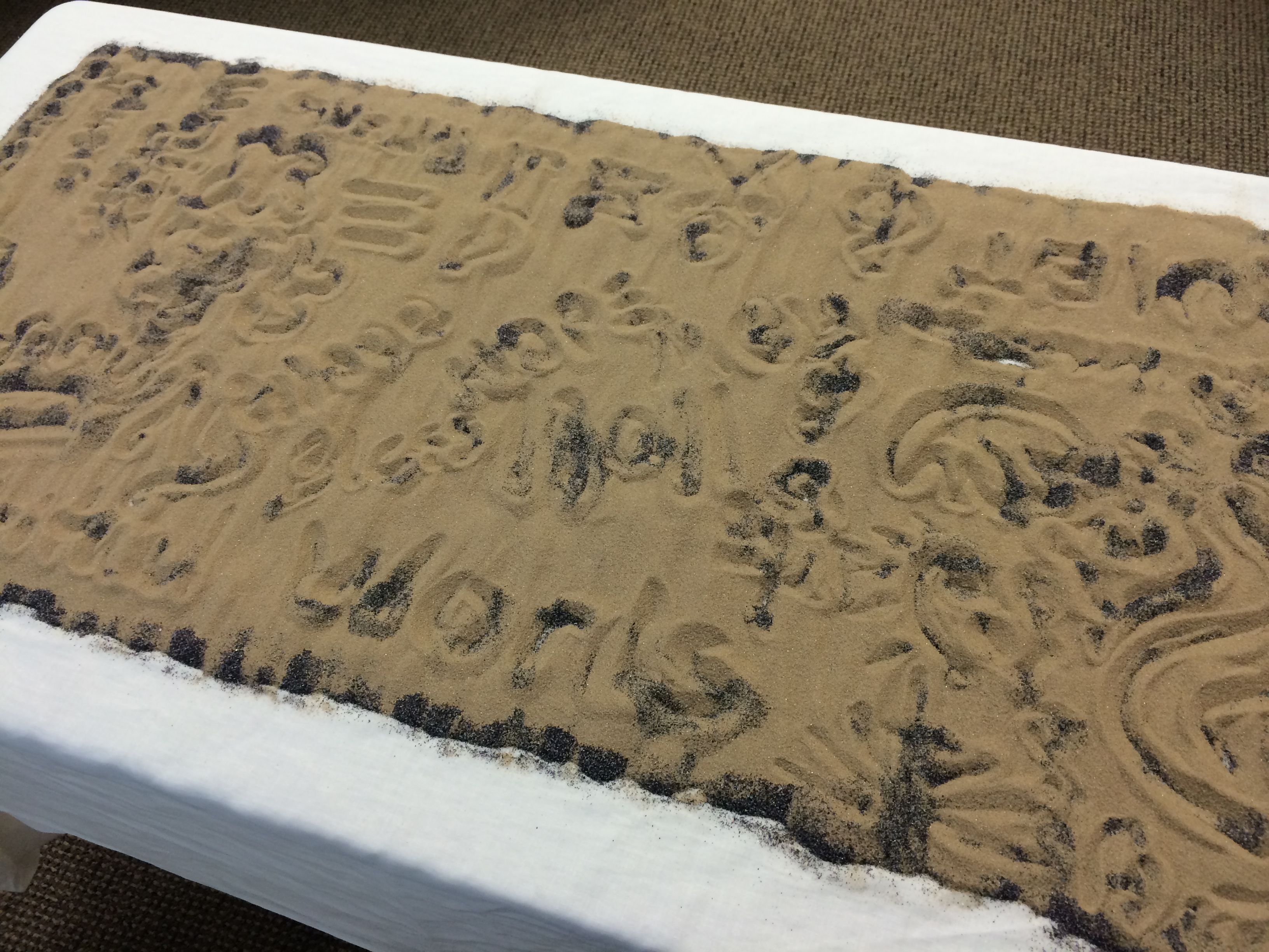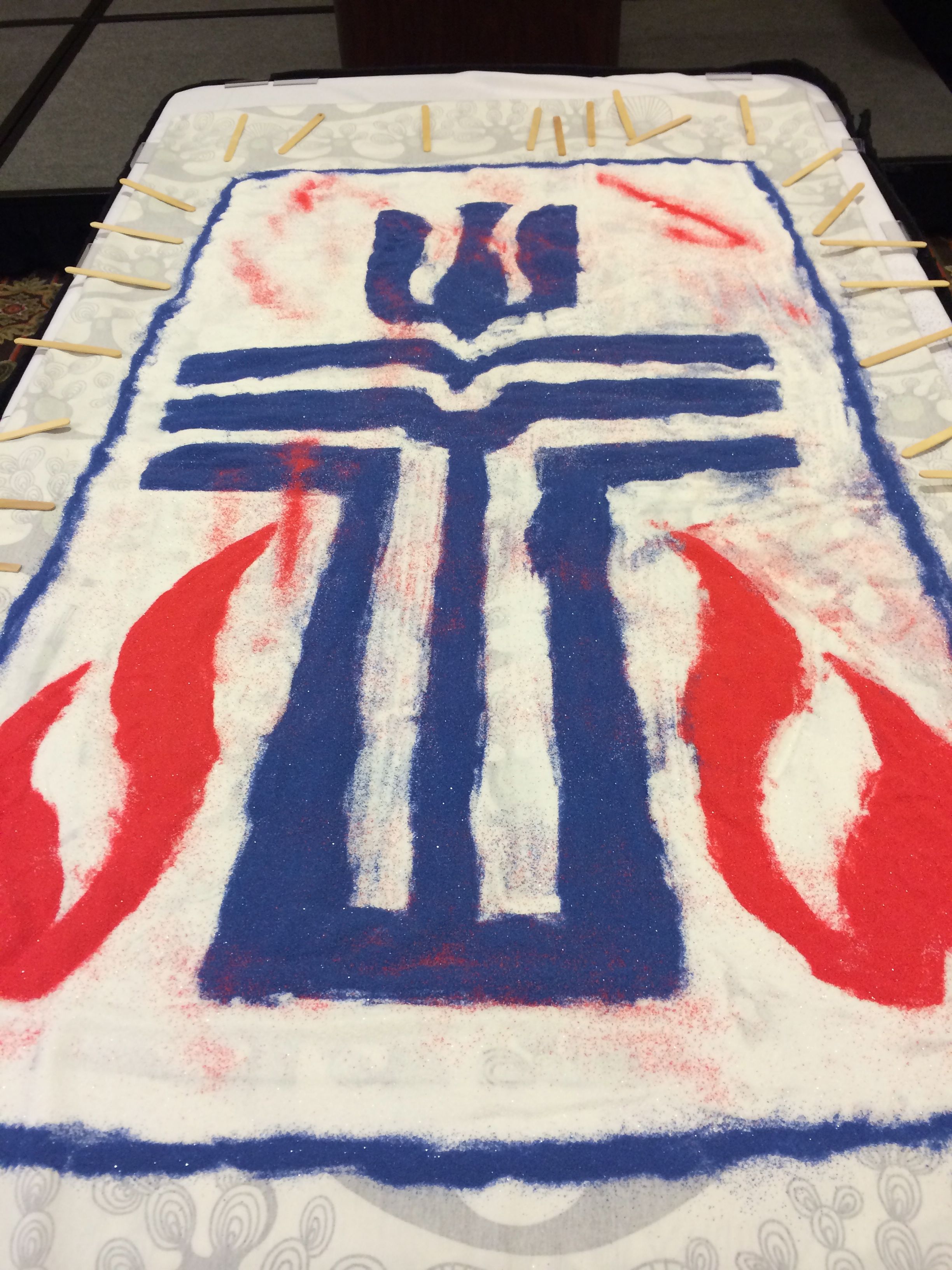 IMG_2922Using cloth, when the sand is dumped, there is still a faint remnant of the symbols and words where the sand clings to cloth. As we let go of what is meaningful for us yet obstacles for others, they don’t go away. They still exist but the power over us isn’t as strong. We are able to open ourselves to find meaning in other ways in worship or the church.