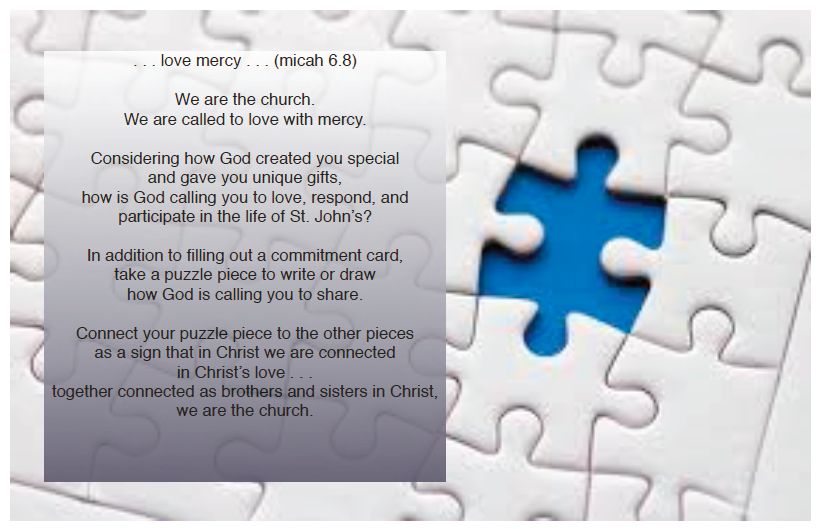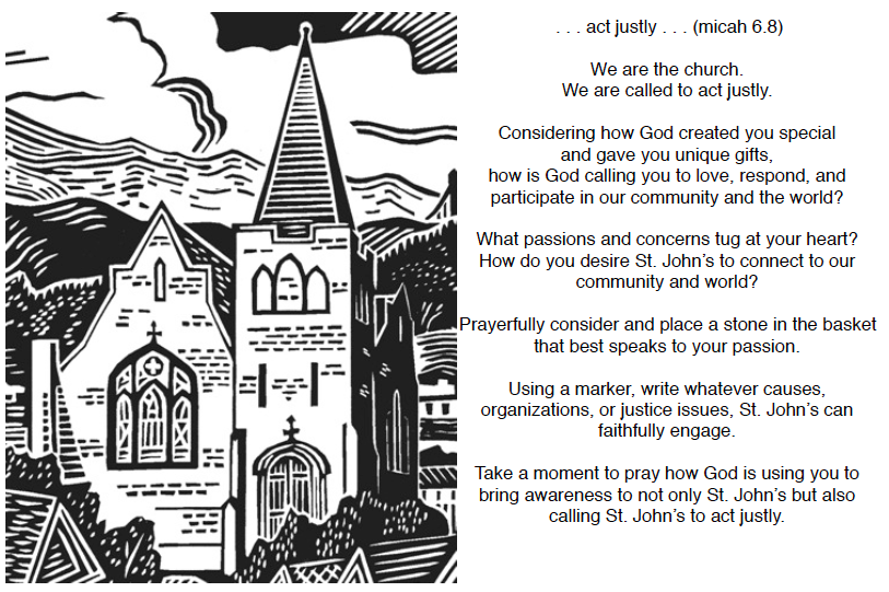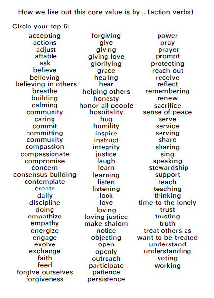 For the past month, we have been focusing on stewardship and creating a new vision statement. For the past four Sundays, worshippers were invited to fill out the following, which said, “St. John’s is . . . Why we follow Jesus – our core value is (1 word to define the commitment concept, meaning for which we live)” and “How we live out this core value is by (3 action verbs).”