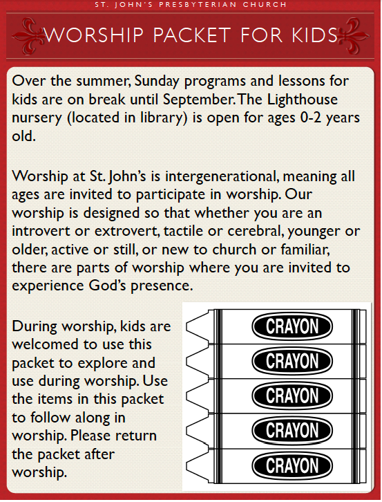 During the summer, my church does not provide Sunday school programs for children. In the past, we have done the typical worship bags and have had varying interest in their use. I have also provided more guided activities, but often that feels like more work than having Sunday school programs. This summer, I’m experimenting with a special bulletin designed for Pre-K, Kindergarteners, and first graders that will follow the flow of worship.