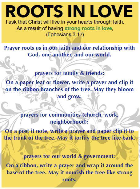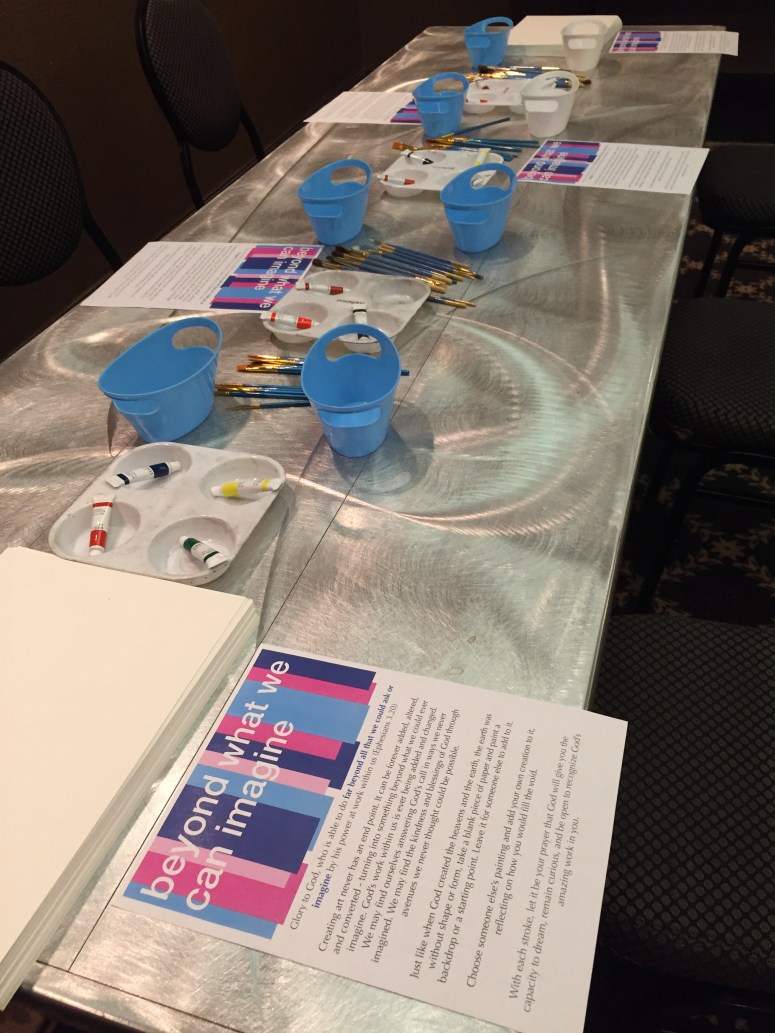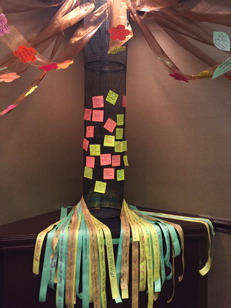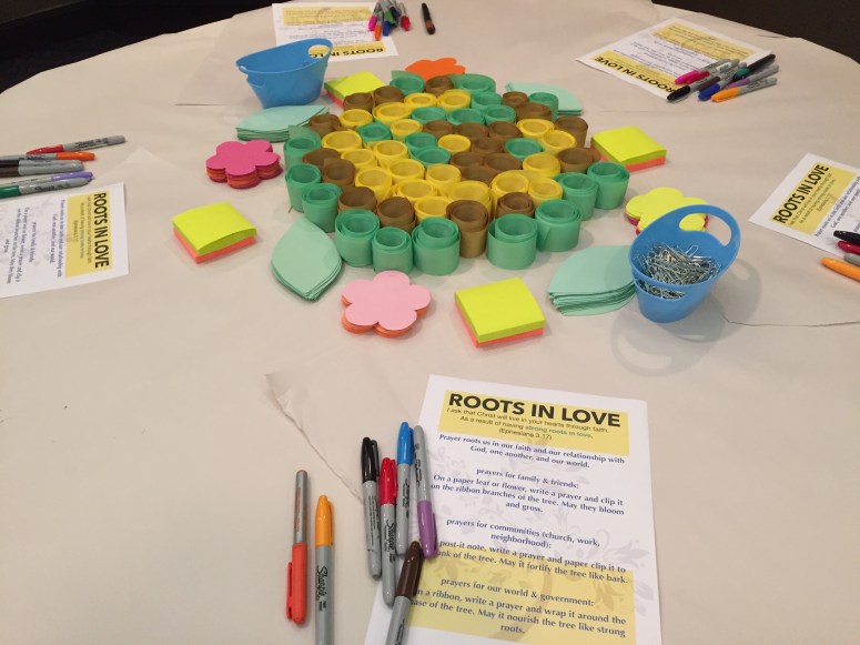 I designed the spirituality center at the Presbyterian Women’s Conference in Toronto. The theme was “Rooted in Love” from Ephesians 3.16-20). I took each verse from the scripture and connected it to a prayer activity. I also tried to have a variety to compliment those who prefer hands-on prayers, wordy prayers, and crafty prayers.