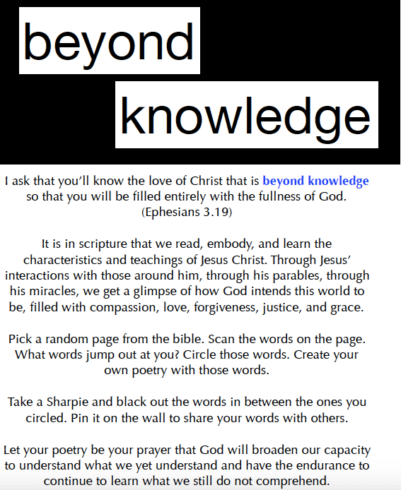 Materials: old bible pages, highlighters, pens, black sharpies