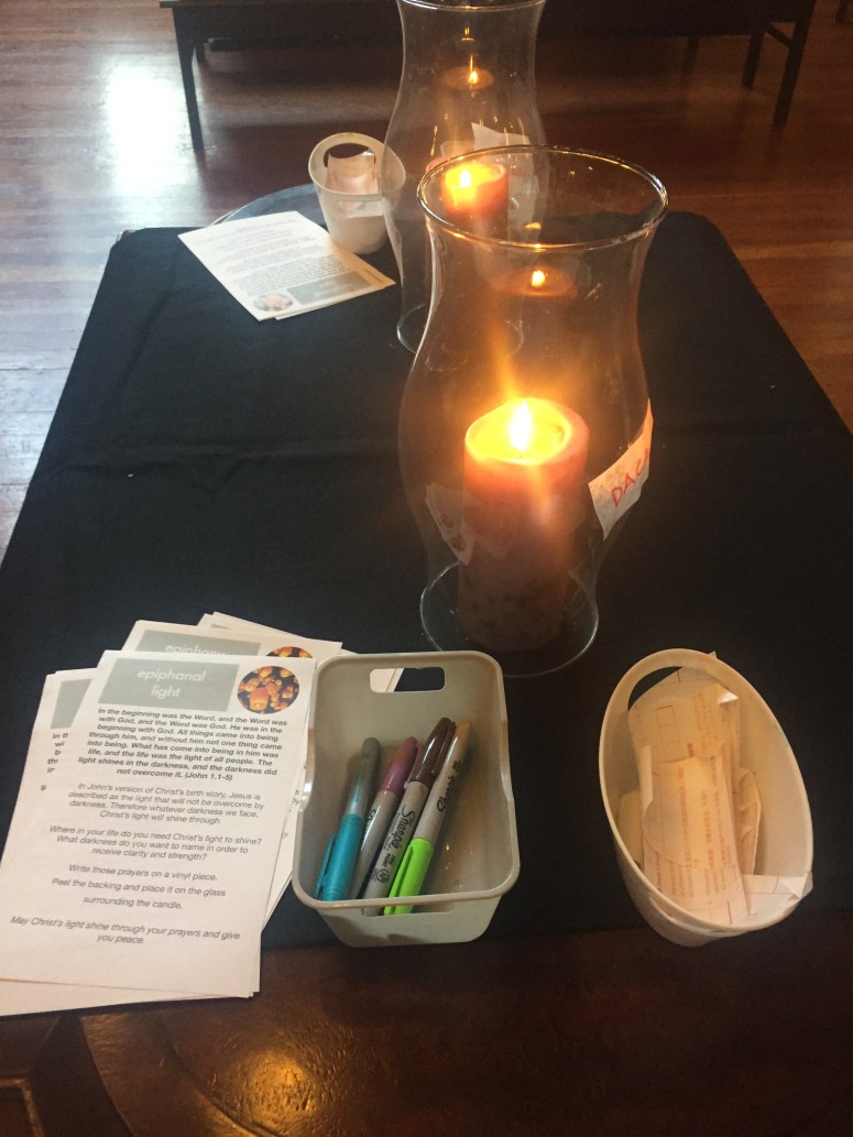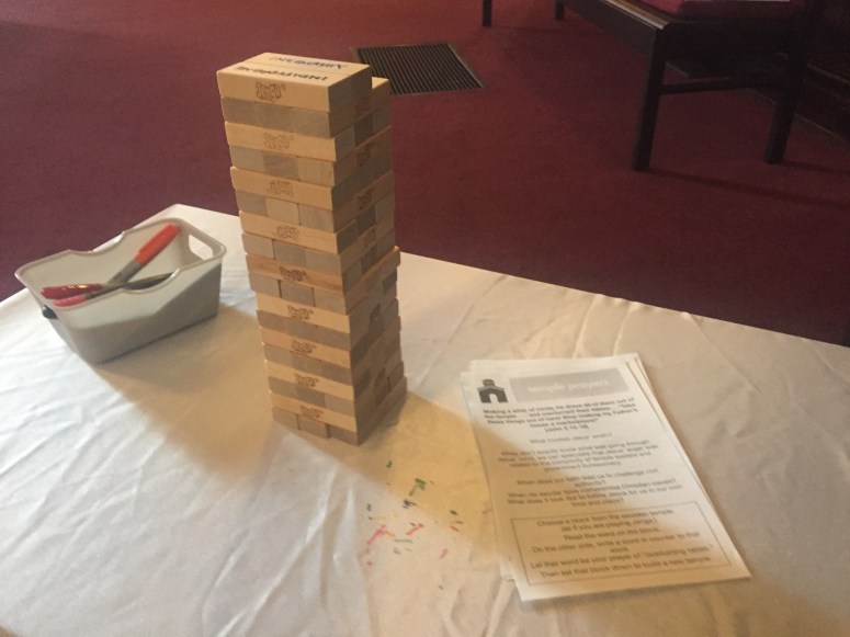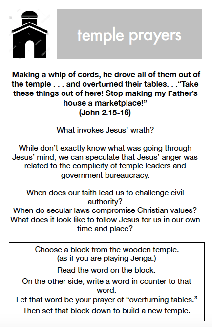 Jesus cleansing the temple is usually told during Lent. However, I’ve been going through the gospel of John at the beginning of Epiphany starting with Jesus calling the disciples. So the prayer stations are a combination of John 1 when Jesus calls Nathanael, John 2 when Jesus cleanses the temple, and the season of Epiphany.