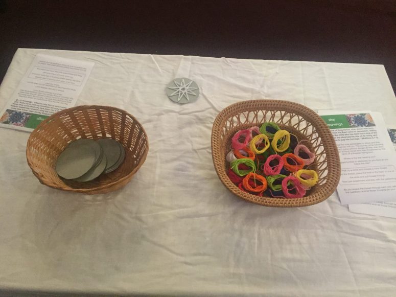 I used the star pattern on this blog site and folded them up to resemble figs. I used a tall vase and branches to make a simple tree to hang the “figs.” We had done this in the previous worship services so this station is just adding more “figs” to the tree. You can read more about star words and a list of words here.