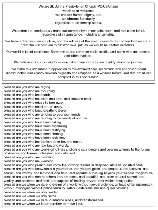 On the one year anniversary of my church becoming a sanctuary church, we reflected on our commitment using prayer stations. There was also opportunity to create one’s own faith statement and reflect on the meaning of covenant.