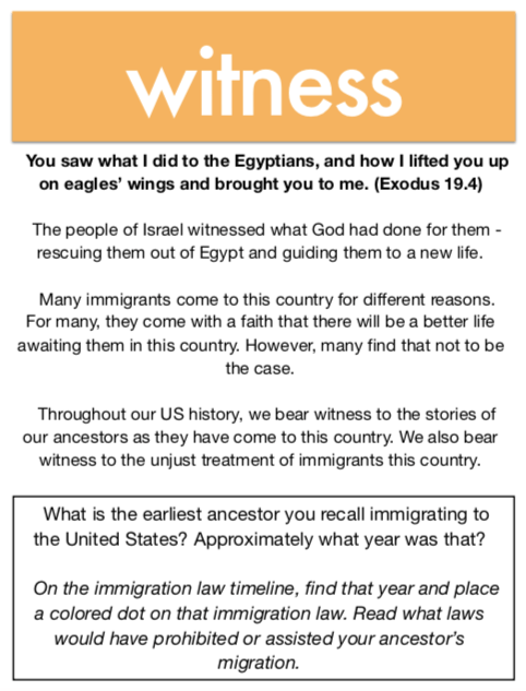 This is a repeat of a prayer station we did when we were discerning to be a sanctuary church. As we discern our recommitment, we are taking another look at the immigration timeline.