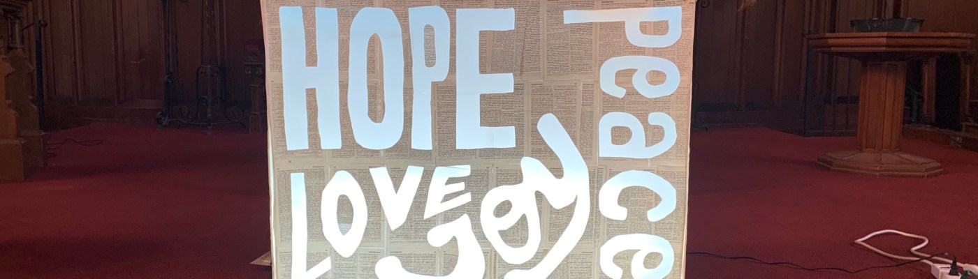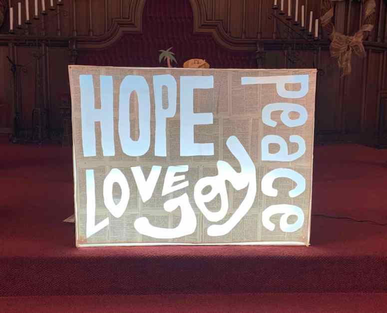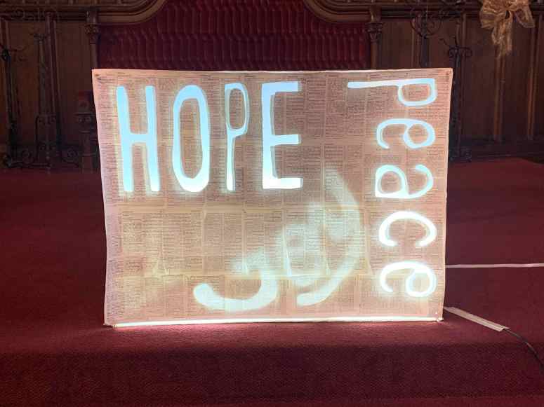 The next layer of the already lit Advent Light Box is peeled away to reveal the words HOPE and PEACE. After the sermon, worshippers were invited to visit prayer stations to reflect on the scripture.