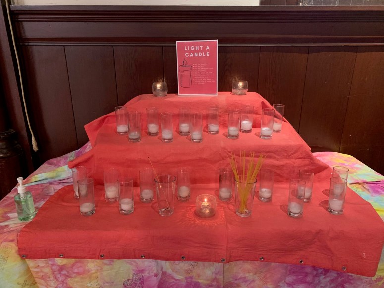 As they exit, people are invited to light a candle. For fire safety, I chose really tall votives, using spaghetti to light the candle. (I placed a fire extinguisher next to the table . . . just in case.)