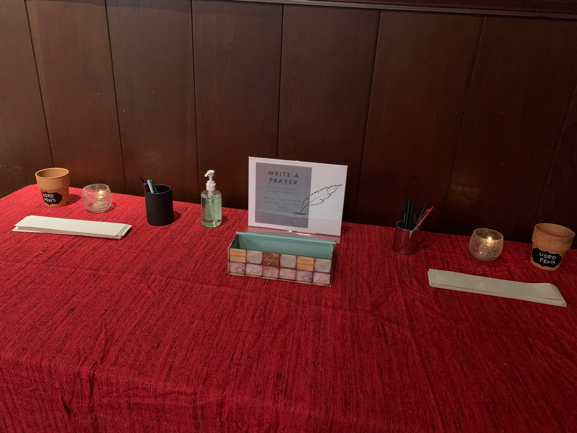 As they exit, people are invited to light a candle. For fire safety, I chose really tall votives, using spaghetti to light the candle. (I placed a fire extinguisher next to the table . . . just in case.)