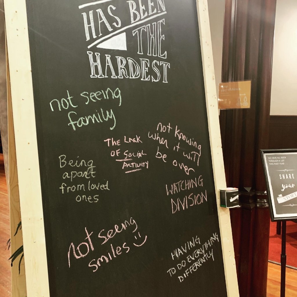 At the 1-year mark of sheltering in place due to COVID-19, St. John’s opened up the sanctuary inviting participants to share their story over the past year. I had the youth in the church prep the boards and come up with questions to ask.