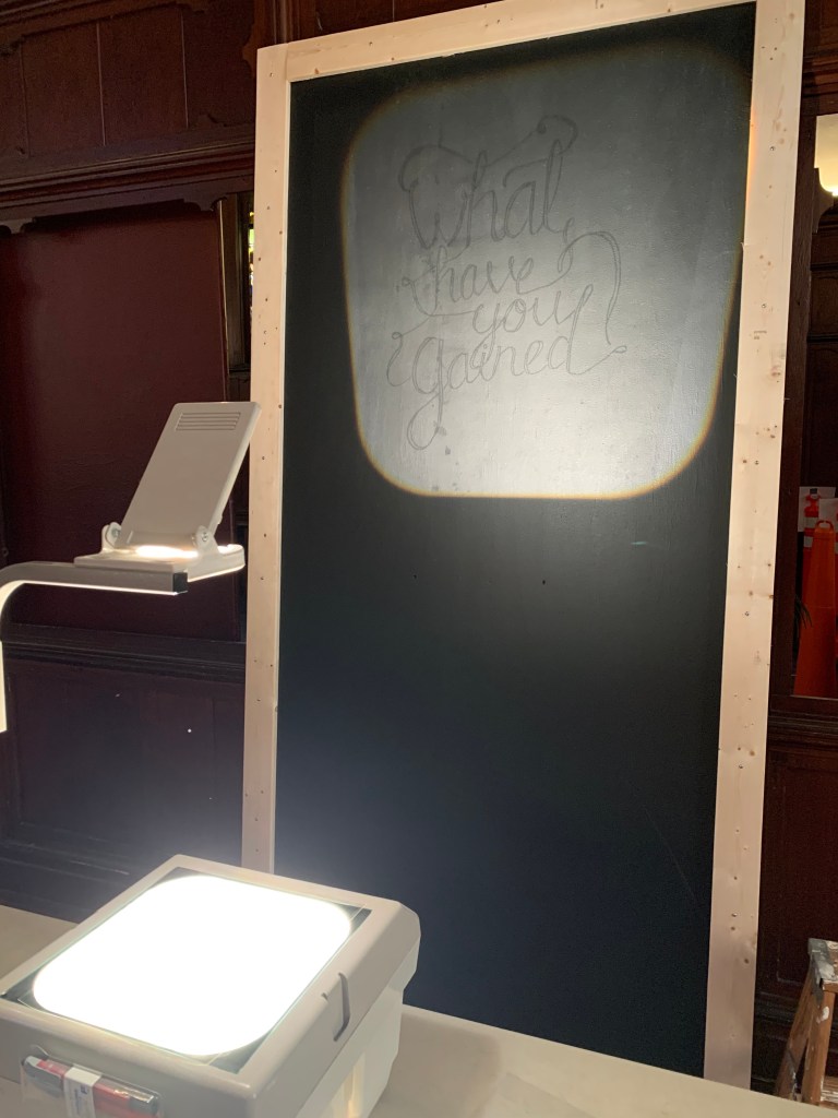 I used an overhead projector to stencil the questions onto the chalkboards. A good tip is to use a Magic Eraser to erase liquid chalk off the chalkboard. Using just water and a rag will leave a chalky residue.