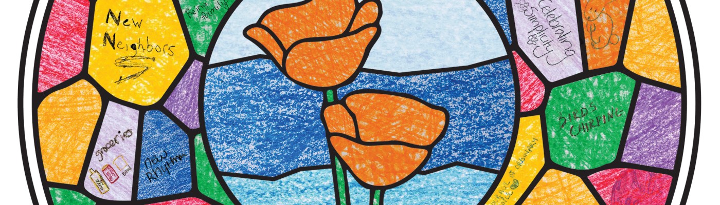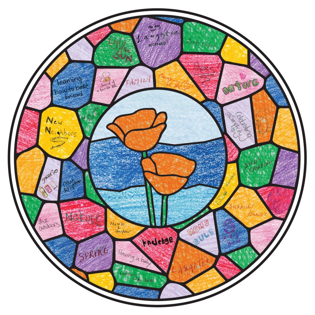 People were also invited to participate in creating a collective “stained glass” art piece. The picture are California poppies that pop up everywhere no matter what the circumstances. Participants were simply asked to think of one word(s) from this past year and a color.