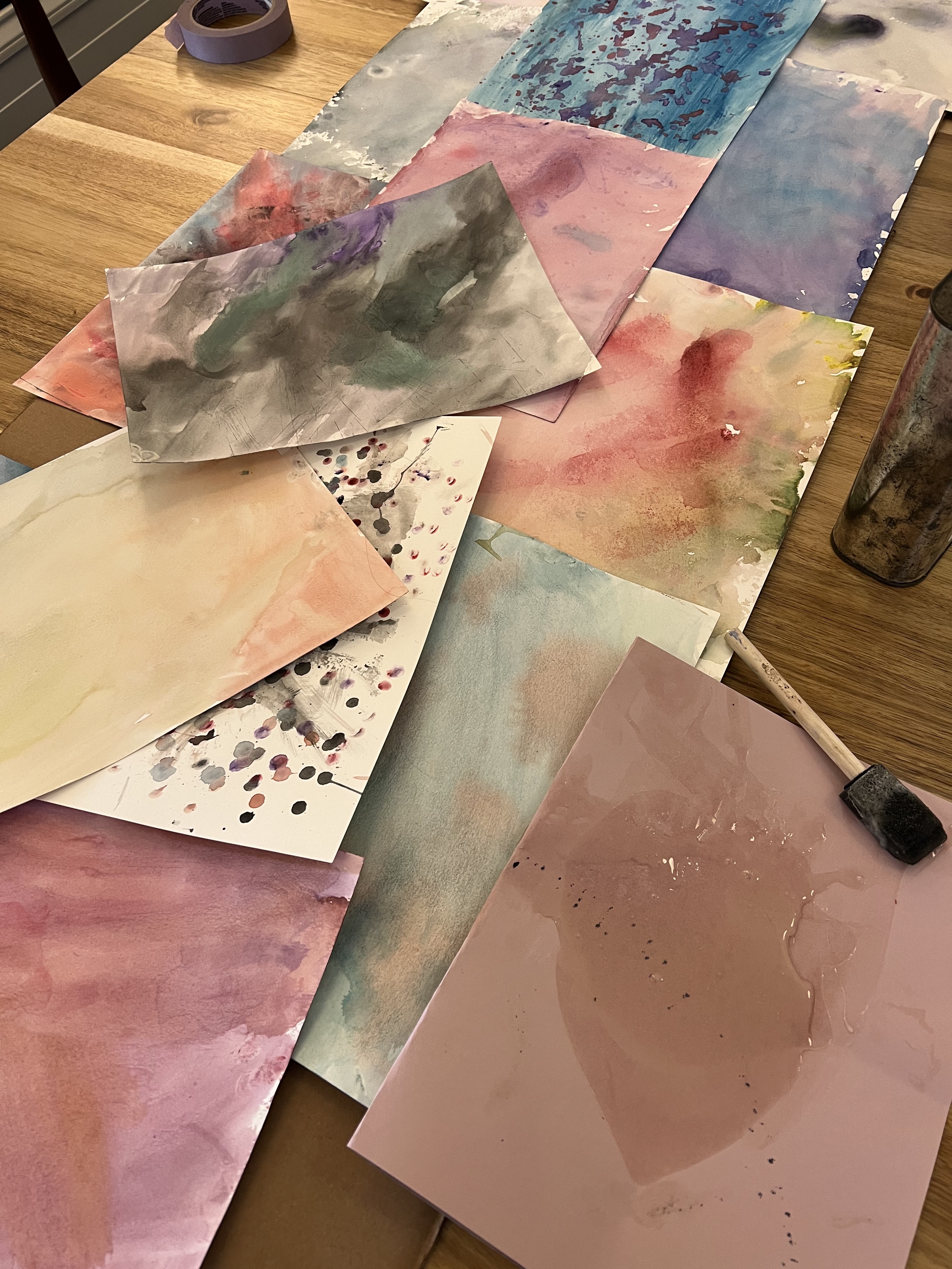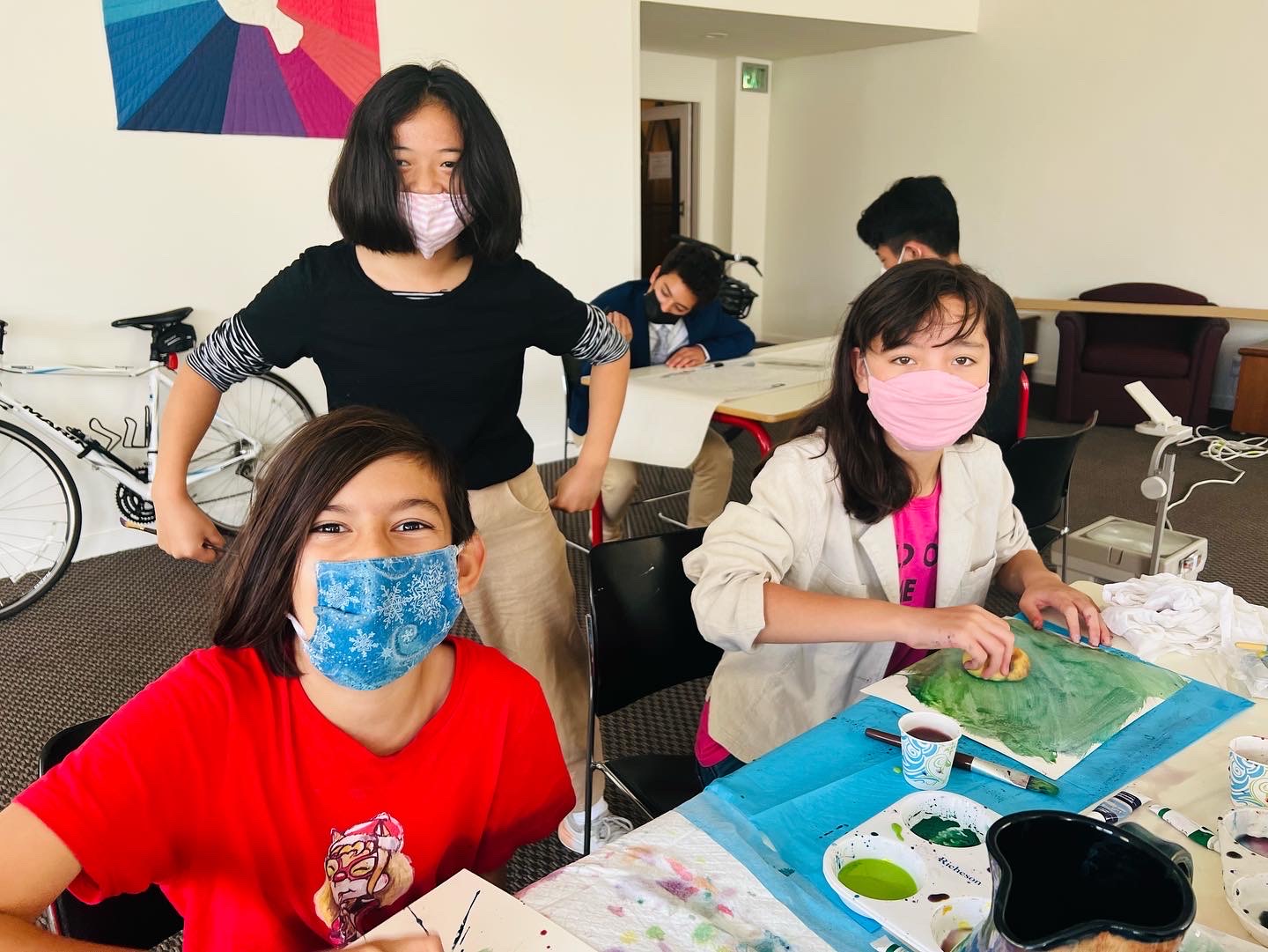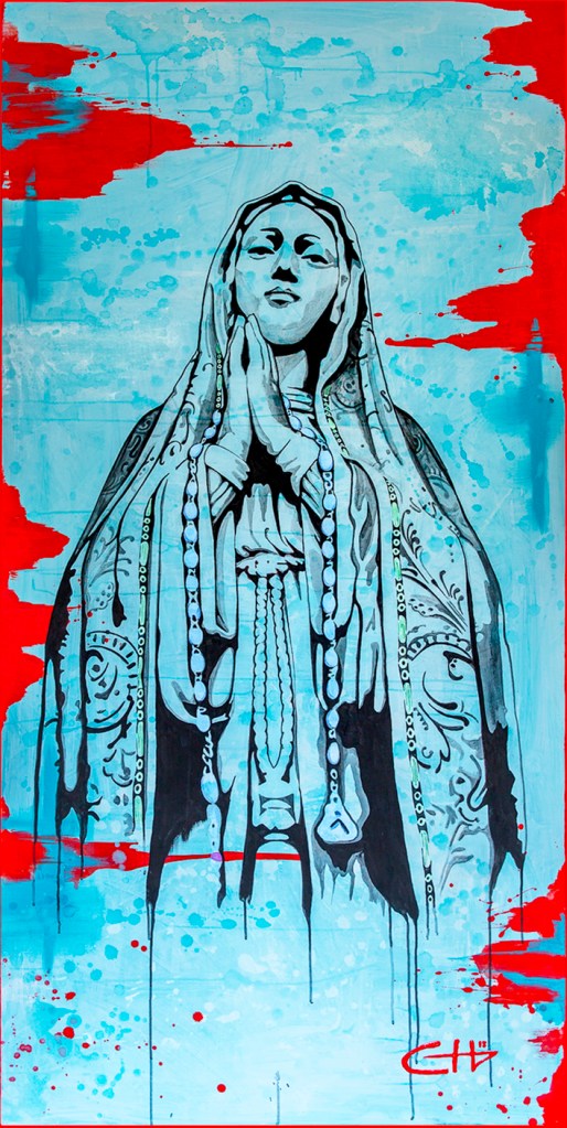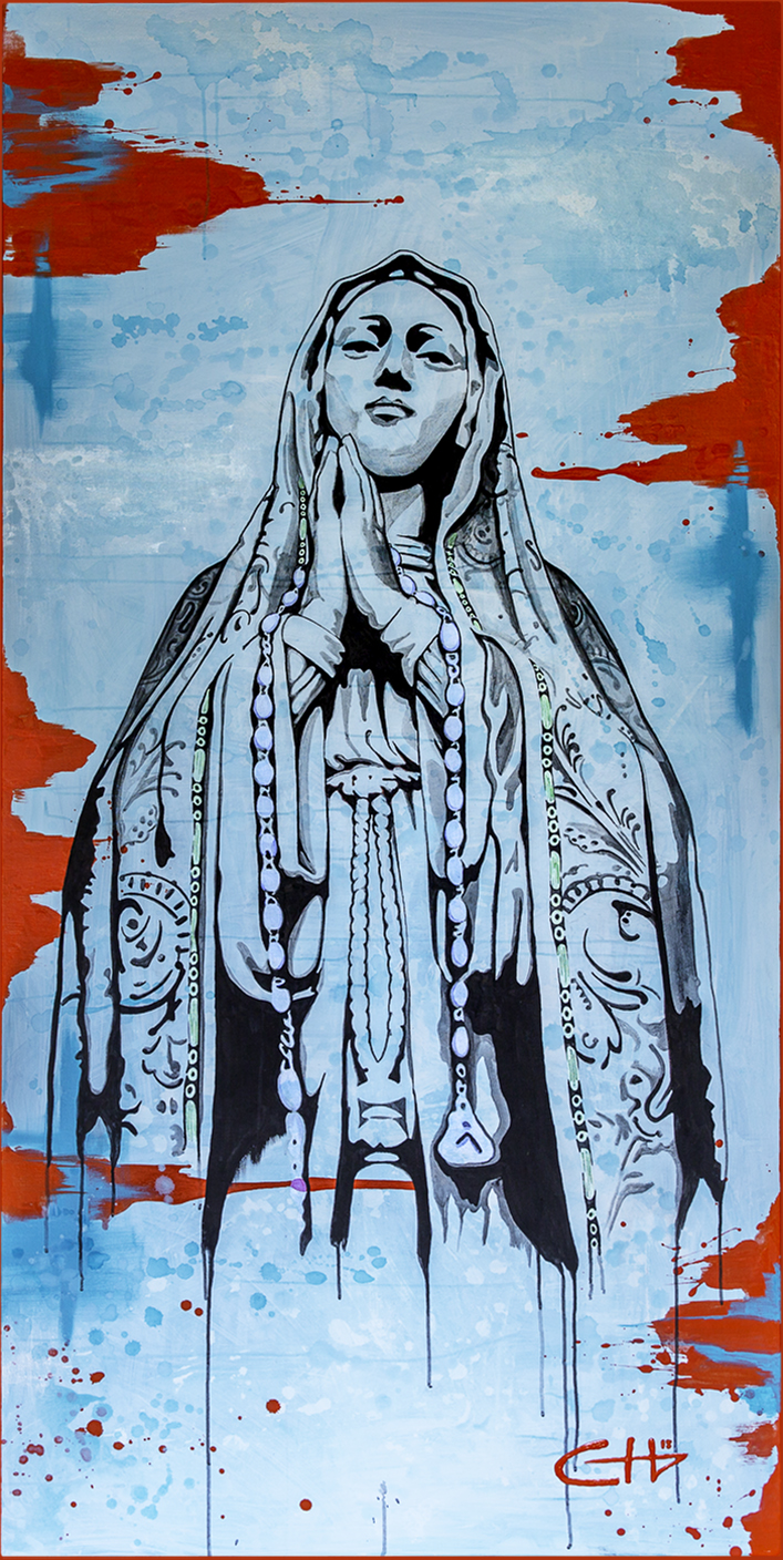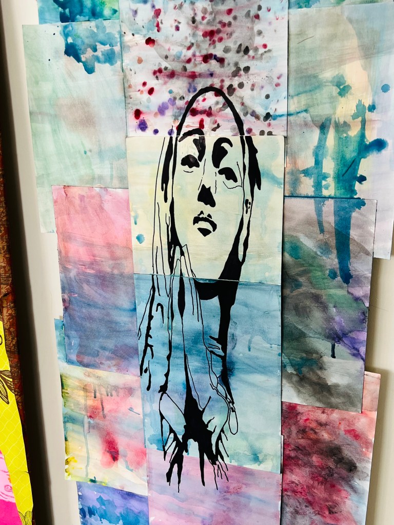 I had the youth make the watercolor background. To make the panels more cohesive, I painted over all the panels with diluted blue watercolor paint. I used red acrylic paint to create some texture. I then traced the Mary image using a projector and black Sharpies.