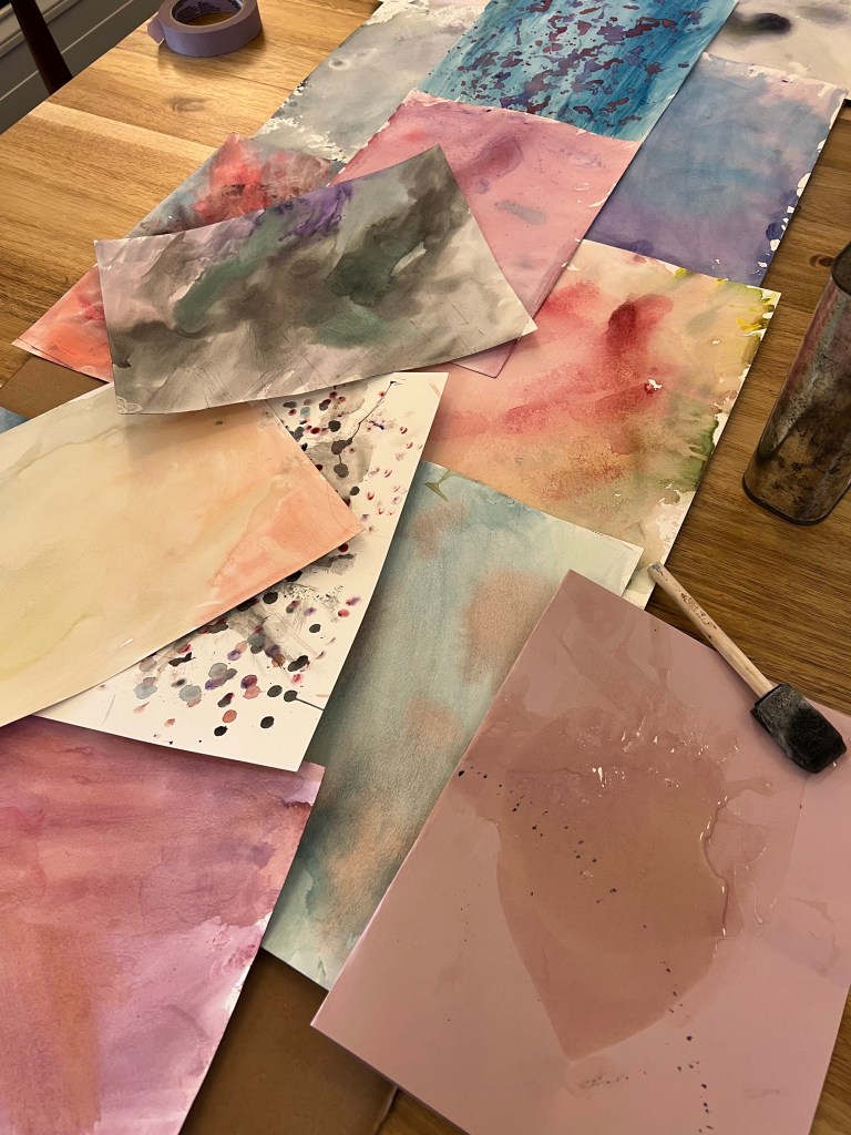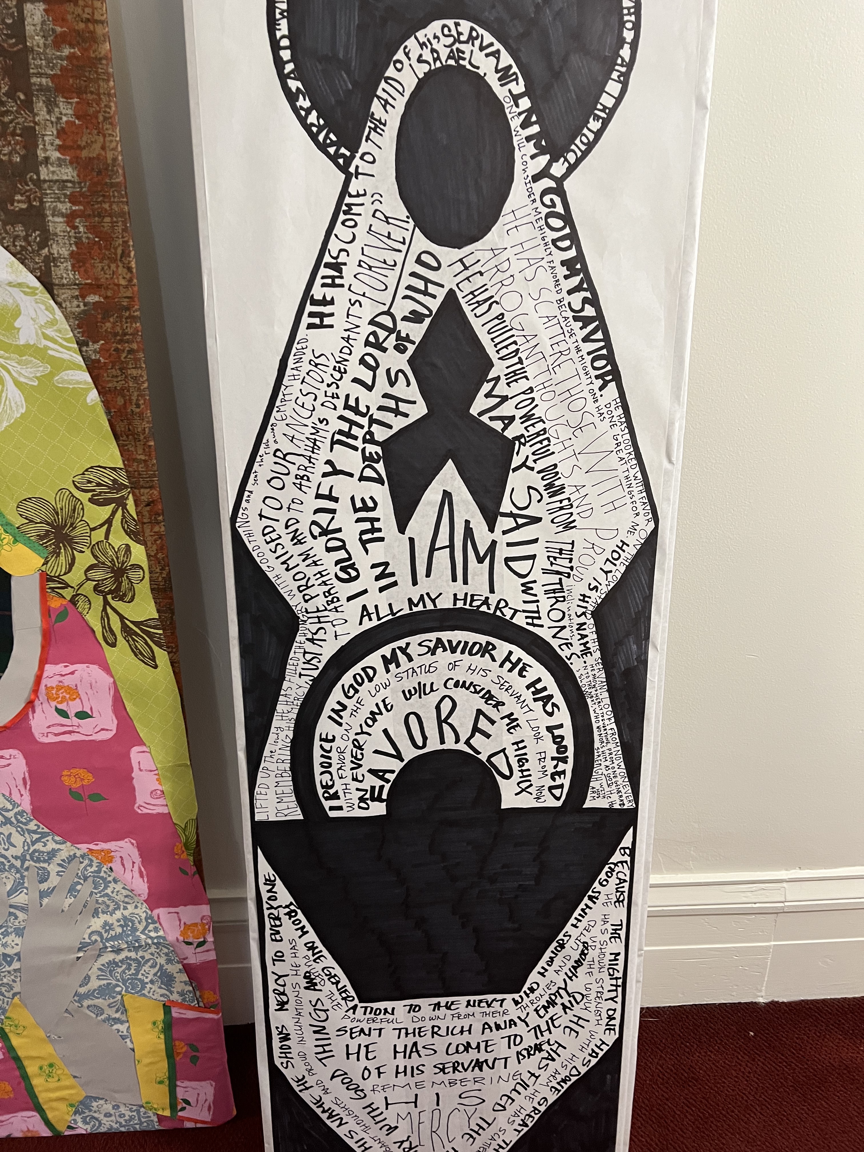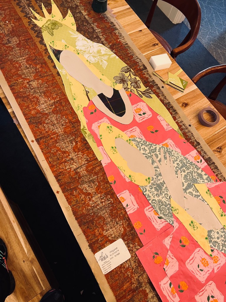 I recreated the above image using wallpaper and wrapping paper scraps. I glued the pieces on a 5′ tall piece of cardboard.