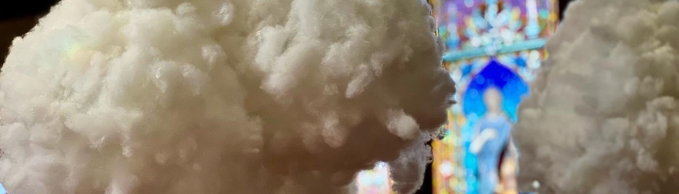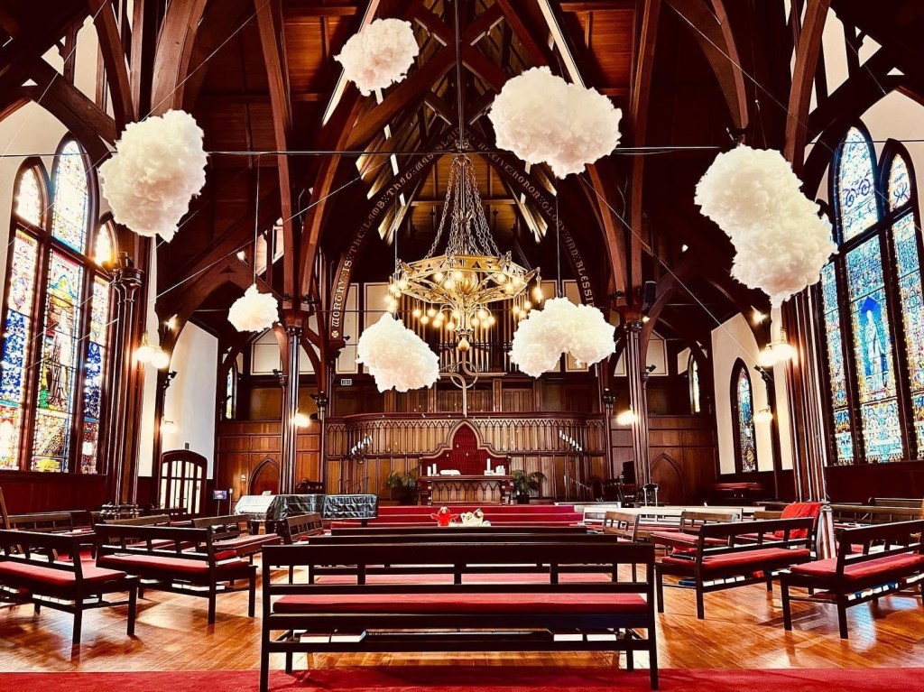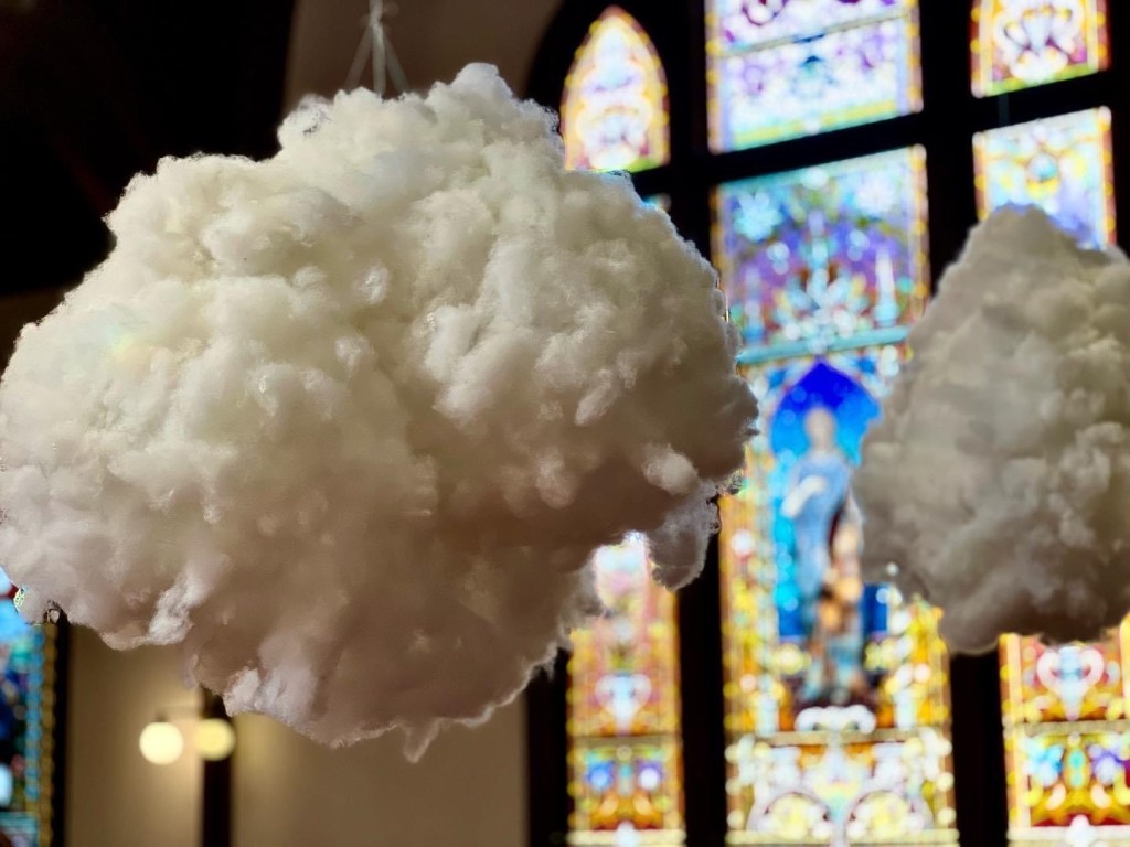 This installation was designed by Associate Pastor, Sam Lundquist. To assemble the clouds, you need polyester batting, hairspray, and paper lanterns.