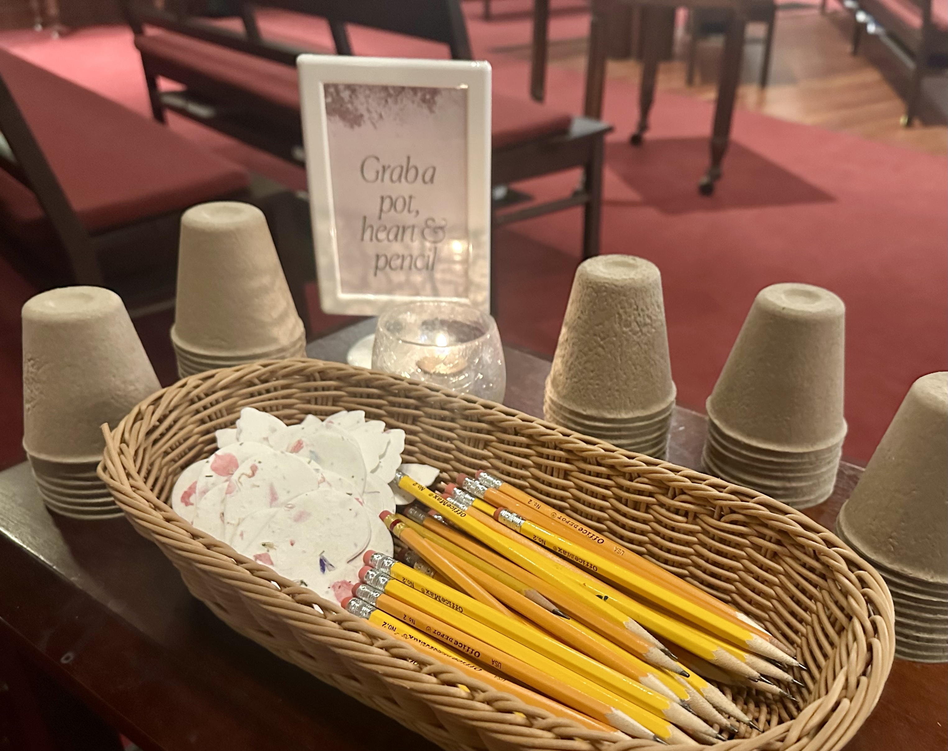 This Ash Wednesday service is focused on prayer. The rhythm of the service is Readings + Prayer + Ritual + Singing. As worshippers enter into service, instruct them to grab a pot, seed paper, and a pencil.